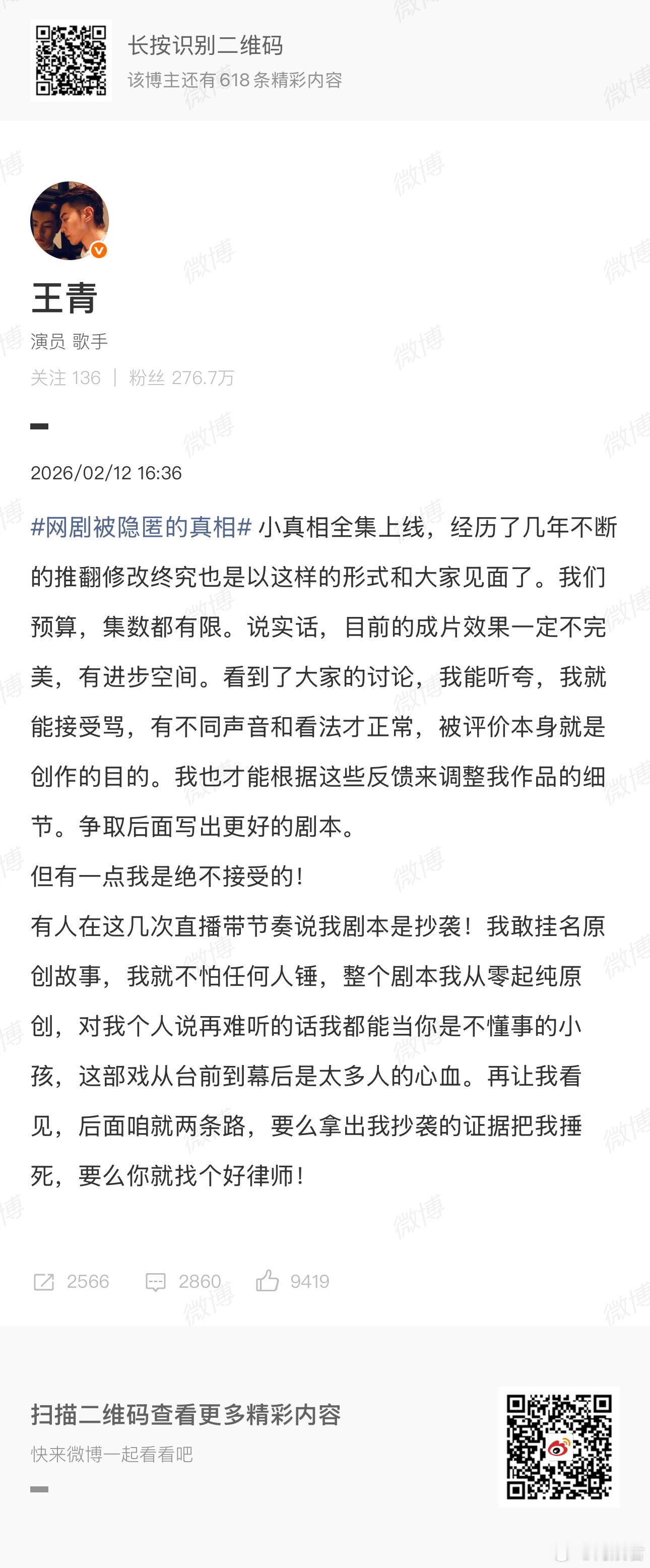 王青警告造谣剧本抄袭者 王青发文警告造谣《被隐匿的真相》剧本抄袭网友,并声明剧本是自己从零开始原创的,这是底线王青警告造谣网友
