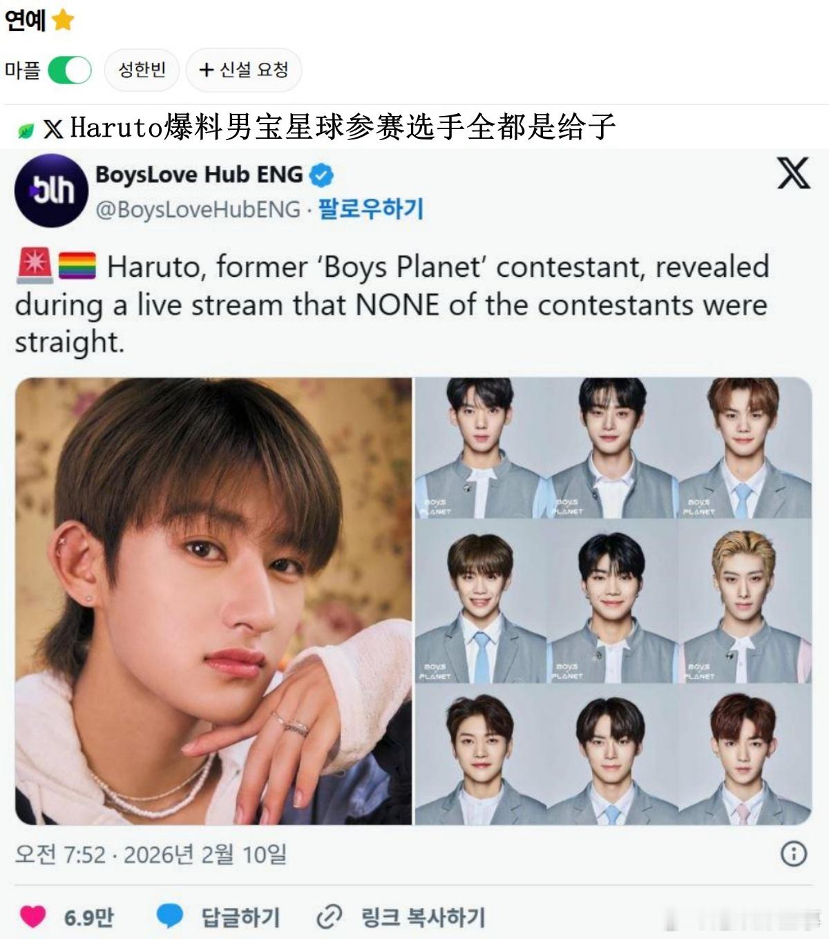 🔥韩网热帖评论翻译🔥男宝星球练习生Haruto直播爆料:参赛选手没有一个是直男cr.instiz