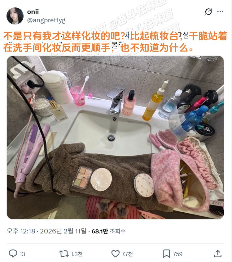 是这样,在洗手间站着化妆比梳妆台更顺手海外新鲜事热点现场