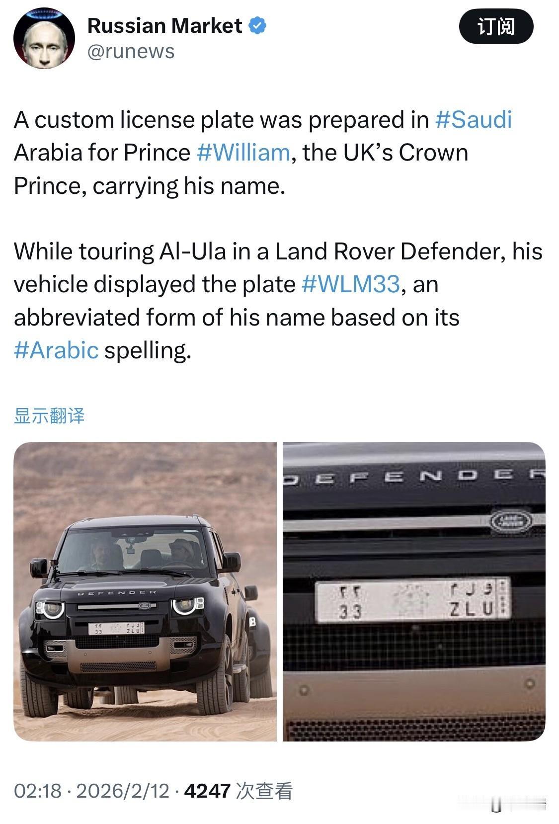 在 2026 年 2 月,英国威尔士亲王威廉 (Prince William) 对沙特阿拉伯进行正式访问期间,这一细节引起了广泛关注。 专属定制车牌:威廉王子在游览沙特著名历史文化遗址 欧拉 (AlUla) 时,乘坐了一辆英产 路虎卫士 (Land Rover Defender)。沙特官方为其特制了编号为 WLM 33 的车牌。 名字缩写含义:车牌上的字母 W L M 正是威廉名字“William”的缩写。在沙特车牌系统中,右侧通常印有对应的阿拉伯字母,而“WLM”在阿拉伯语拼写中可对应威廉名字的发音缩写。 数字 33 的象征:该数字在文化语境中常被视为代表转型、创造力与领导力,体现了东道主对客人的高度尊重与细节上的极致礼遇。 访问背景:此次访问正值英沙两国建交近 100 周年,威廉王子重点考察了 沙兰自然保护区 (Sharaan Nature Reserve) 和 欧拉古城 (AlUla Old Town),关注当地的野生动物保护(如阿拉伯豹的复育)和可持续旅游发展。
