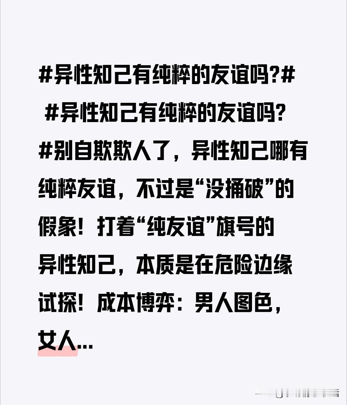 异性知己有纯粹的友谊吗? 异性知己有纯粹的友谊吗? 别自欺欺人了,异性知己哪有纯粹友谊,不过是“没捅破”的假象! 打着“纯友谊”旗号的异性知己,本质是在危险边缘试探! 成本博弈:男人图色,女人图利或情绪价值,“随叫随到”不过各取所需。 边界漏洞:聊心事、吐槽伴侣、深夜谈心,卸下防备就会消耗另一半信任。 扎心真相:纯友谊在“看不上”或“够不着”时才有,知己是找补缺憾。 有边界是朋友,没边界是备胎!认同点赞、收藏,保持清醒!你信异性有绝对纯洁的友谊吗?