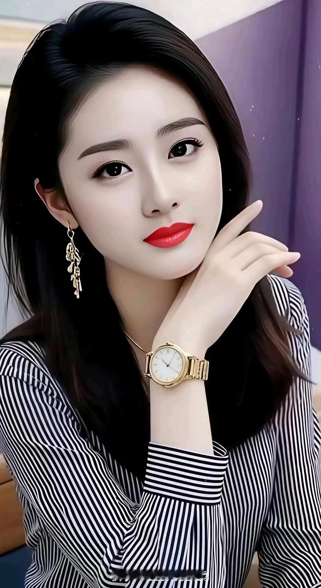 优雅气质,黑白条纹穿搭,精致妆容,时尚手表,自信微笑。