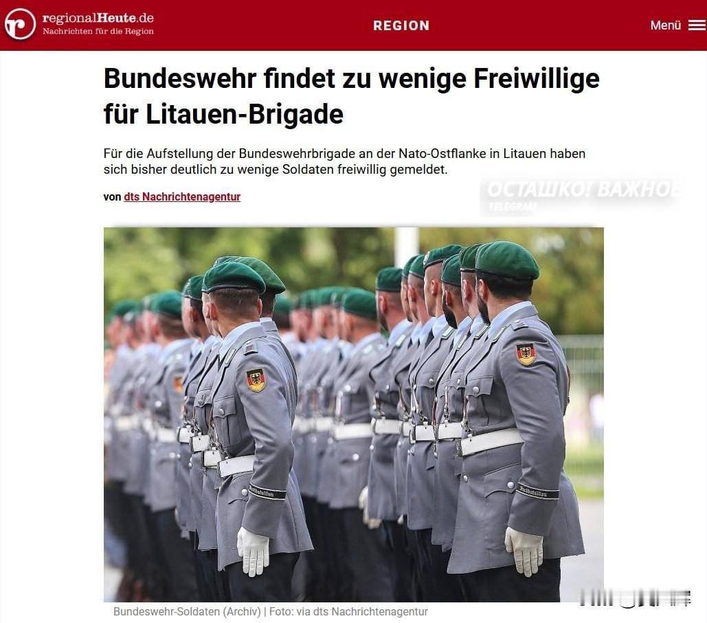 【德国兵力不足,难以组建驻立陶宛北约旅】 为在北约东翼立陶宛组建联邦国防军旅级部队,目前志愿报名人数严重不足。据德国陆军内部统计: -- 第203坦克营和第122摩步营的报名人数仅为所需人数的 28%–47%; -- 旅主力部队(炮兵、侦察、工程、保障分队)情况更糟:1971个岗位,志愿报名者仅约10%。 德国防长皮斯托瑞斯曾宣布,计划到2027年在立陶宛组建一支满编旅,采用志愿兵役制,并承诺提供高额补贴作为激励。 目前新计划: -- 向所有符合条件的士兵发送 4.3万份 动员通知; -- 组织赴立陶宛的日间参观,展示军营条件; -- 义务服役期从 2年缩短至1年。 德国国防部承认,志愿兵仍严重短缺,组建该旅仍是“艰巨任务”。