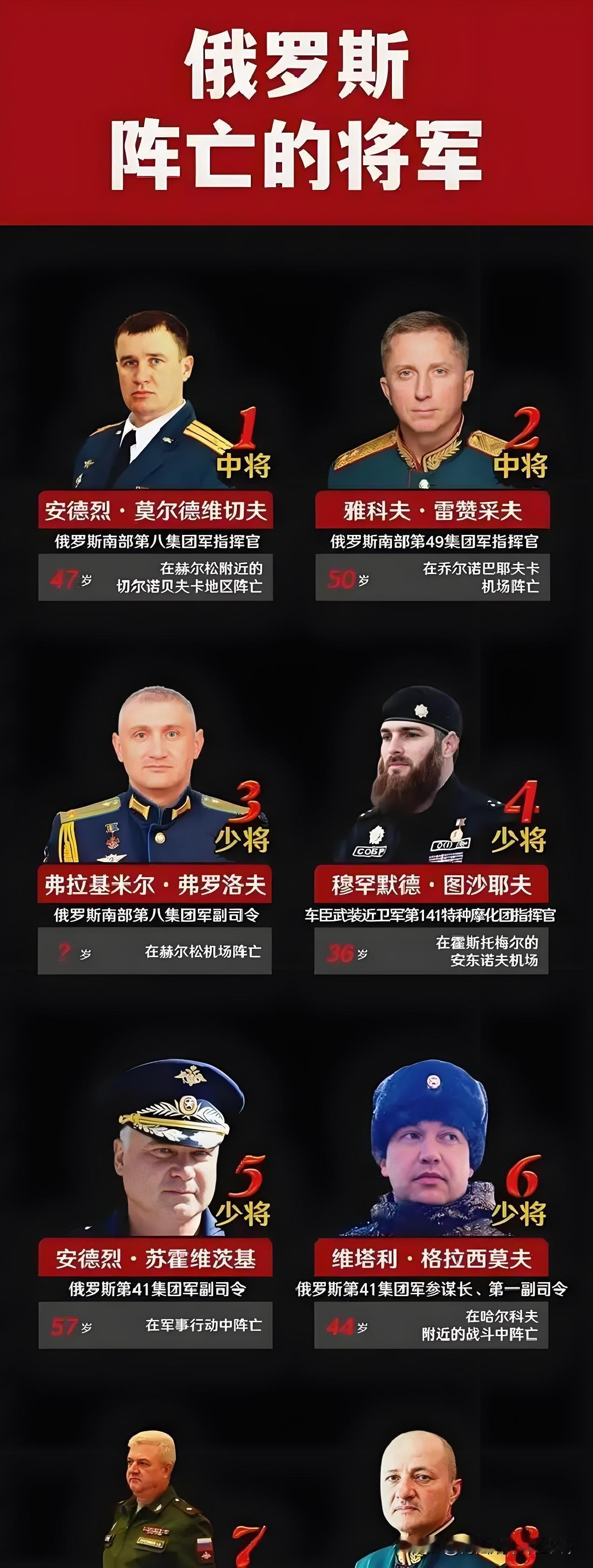 你敢信吗?一场现代战争,高级将领居然能阵亡这么多人? 俄乌冲突打到现在,俄军在乌克兰战场上损失的将领数量,已经超出了很多人的认知。截至2026年2月,多方信息核实,俄军已有19名将官阵亡,其中包括中将、少将,还有参战的退役将领,这样的伤亡规模,在现代正规战争里极为罕见。 2022年开战初期,俄军就接连损失6名高级指挥官。安德烈·苏霍维茨基少将成为首位确认阵亡的将官,第8集团军参谋长罗曼·库图佐夫中将,更是俄方官方承认的最高级别阵亡将领,一时间震动国际军情圈。 2023年,乌军的精准打击能力全面提升,又有5名将官倒在前线,南部军区副司令、集团军副司令等关键指挥人员,大多因指挥所被锁定遇袭身亡,斩首战术效果明显。 2024到2025年,俄军再损失8名少将,涉及防化、电子战、陆军作战等多个重要领域,指挥层的损失一直没有停止。 之所以出现这种情况,一方面是俄军习惯靠前指挥,将领位置更容易暴露;另一方面是乌军得到西方情报和远程武器支持,对指挥中枢的定位和打击能力大幅提高。 一场冲突,近四年时间,19位将官阵亡,这不仅是战场惨烈的直接体现,更彻底改变了人们对现代战争指挥模式的认知。