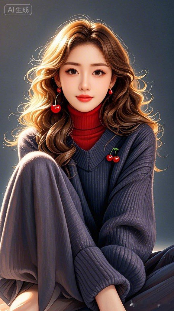 慵懒佳人,棕金色长卷发丝般柔顺。红高领超大宽松羊毛衫,配飘逸阔腿裤,忧郁俏颜配樱桃耳饰。纯色暗底,质感细腻,空间感十足,温暖又带淡淡忧伤。