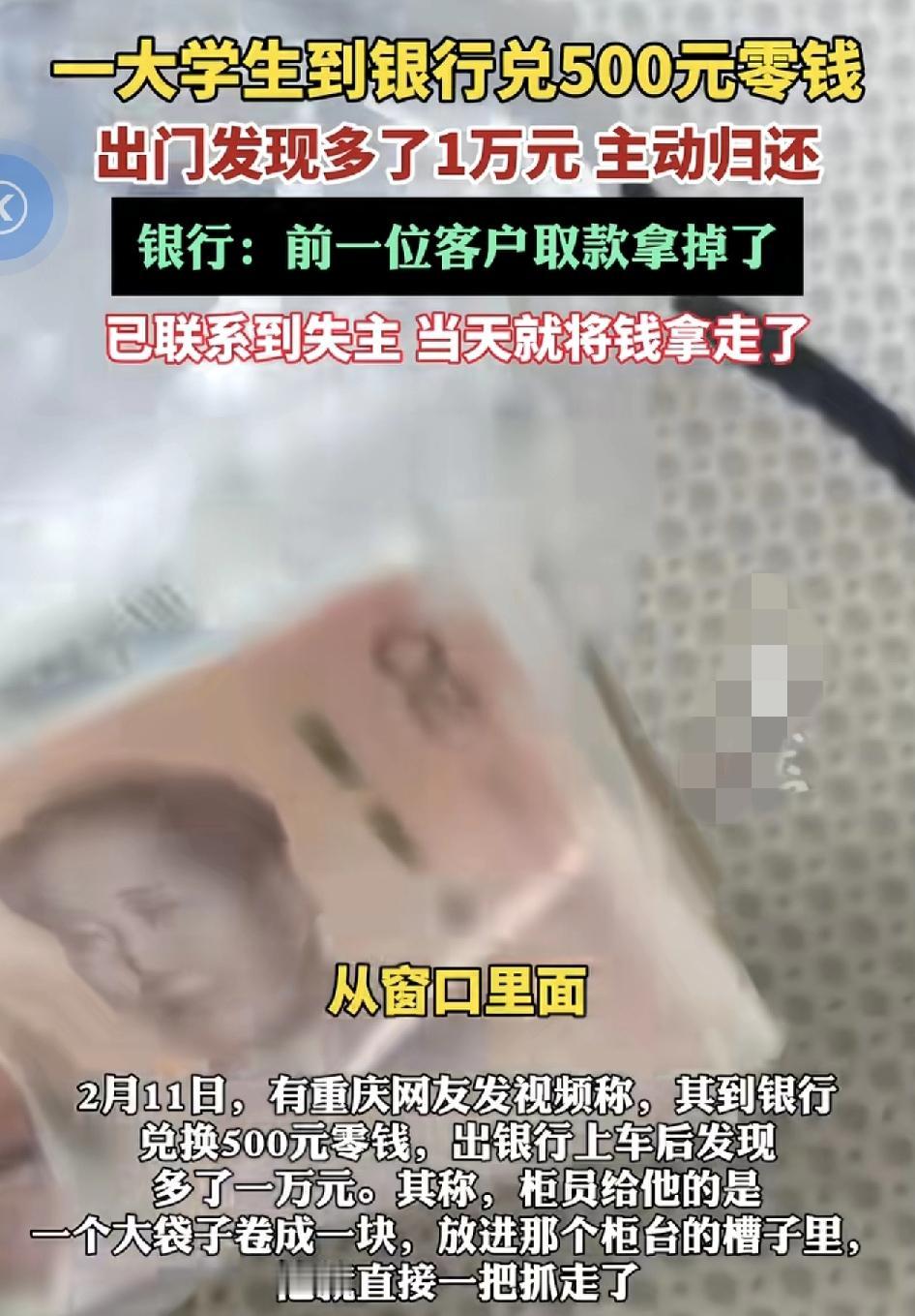 重庆一位男大学生到银行兑换500块钱的零钱,但是兑换好之后就直接拿着走了,回家之后发现多了一沓钱,只是一共是1万块,心想肯定是柜台工作人员拿错了。回去之后说明情况,原来这1万块现金是前一位客户忘了拿走的。最后联系上了失主。大家都觉得前一位客户是多么不在意钱,身上少了1万块居然都不知道。