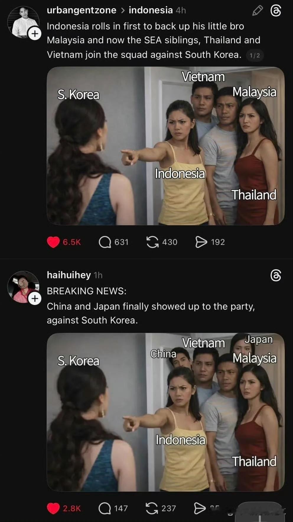 最近在外网上,韩国和东南亚网民的口水仗起因 中国网民未大规模参战,主要是出现在各方的吹嘘中:“⏰是站我们这边的!