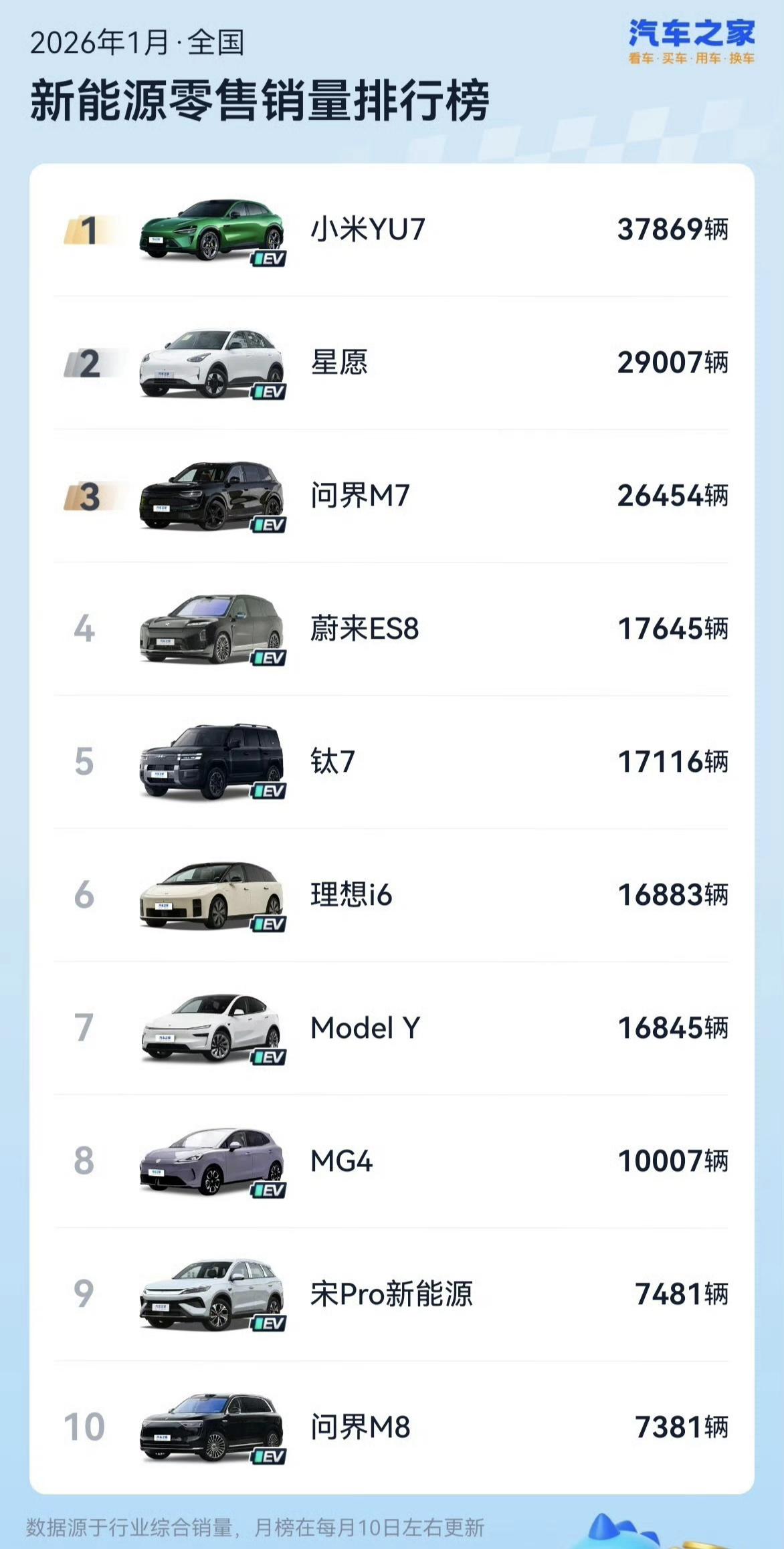 谁能想到小米SU7刚上市就是爆款,小米YU7上市也是爆款,而且更夸张的是它1月份的销量37869辆,在新能源SUV车型里面销量是最好的!在20万元区间里面是非常亮眼的,其实也可以看出雷军造车是非常认真的,同时消费者对他的认可度也是非常高。