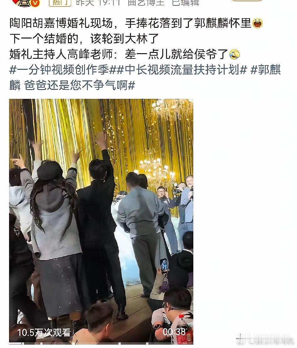 郭麒麟,冲上热搜!2月12日,“德云社少班主”郭麒麟突然冲上热搜,不是啥好事,而是往后的日子难过了,这到底是怎么回事呢?事情得从两天前说起。2月10日德云社封箱演出,郭德纲、郭麒麟父子同台,老郭当场开启催婚模式,调侃儿子三十岁该成家,郭麒麟机智回怼“爸爸还是您不争气”,笑翻全场。本以为只是舞台段子,没想到隔天就照进现实。2月11日,德云社陶阳与麒麟剧社胡嘉博大婚,德云社全员到场,高峰主持、郭德纲主婚,排场拉满。抛捧花环节,花束精准“砸”中郭麒麟,少班主被动接花,全场瞬间起哄。郭德纲趁热打铁,主持婚礼时现场喊话:“特地带郭麒麟来,给他打个样,看啊,儿子,结婚就是这样式儿。”台上催婚、台下接花,郭麒麟被安排得明明白白。网友纷纷调侃:封箱刚说完,婚礼就兑现,少班主的催婚进度条直接拉满,想躲都躲不掉,再不结后面的日子就难过啦!