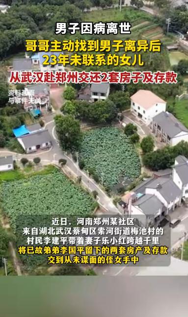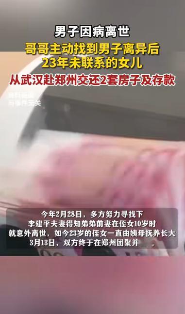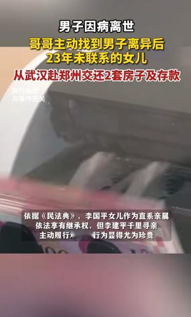 “这样的人品全国罕见!”男子离异后1岁女儿判给前妻,从此再无交集!不料,23年后男子去世,哥哥竟不顾反对“千里”寻亲,主动将弟弟的2套房和存款转到素未谋面的侄女名下! 郑大哥(化名)年轻时一直在郑州拼搏,靠着勤劳的双手和不懈的努力,他早早地建立起了自己的事业和家庭,那时候,他遇见了孙女士(化名),两人很快相爱并步入了婚姻的殿堂。 婚后的生活美满,特别是在他们的孩子出生后,夫妻俩的生活更是充满了欢声笑语,然而,命运并不总是眷顾每一个人,家庭的幸福并未能持续太久。 孩子一岁时,夫妻之间由于性格不合发生了较大的摩擦,最终,两人选择了离婚。 离婚后,孩子判给了前妻孙女士抚养,郑大哥虽然心中不舍,但也未曾再与孙女士有任何交集,之后,郑大哥决定离开郑州,回到武汉的家乡,开始了全新的生活。 虽然过得平静,但郑大哥心底始终有着一份对女儿的牵挂,2024年,郑大哥不幸因病去世,亲人们纷纷感到痛惜。 在郑大哥去世后的继承问题上,亲戚们普遍认为,郑大哥的财产应由他的亲生女儿继承,毕竟,他和孙女士离婚多年,女儿一直由孙女士抚养,郑大哥也未再婚生子。 然而,郑大哥的哥哥老郑(化名)却对这一决定表示强烈反对,老郑认为弟弟去世后,所有财产应由家族继承,尤其是家中的房产,应该由他来管理和分配,老郑坚信,弟弟的遗产理应由自己来掌控,而不是由一个离异后的家庭成员来继承。 老郑的阻挠让家人们感到困惑和愤怒,尤其是在经过多次家庭会议后,大家普遍认为,郑大哥的女儿才是唯一的合法继承人, 然而,令所有人都未曾预料到的是,在2025年,老郑得知了一个令人震惊的消息,孙女士在侄女十岁时因病去世了,孙女士的亲戚们照顾着侄女,而孙女士的去世使得这个家庭面临更大的困难。 原本风平浪静的家庭风波重起涟漪,老郑获悉消息后,做出惊人决定,他不再从中作梗,不再阻挠郑大哥遗产的继承。反而在得知孙女士去世的消息后,毫不犹豫地开始联系孙女士的亲属,甚至亲自踏上了千里之外的旅程,去寻找那位与他素未谋面的侄女。 历经很多艰辛,老郑不懈努力,终成功将弟弟郑大哥遗留的两套房产及存款,悉数转至侄女名下,完成了一份责任与情谊的交接。 这个决定在家族内部引发了极大的争议,许多人不理解老郑为何要将弟弟的遗产交给一个与他毫无关系的侄女,尤其是考虑到老郑此前曾强烈反对女儿继承遗产的立场。 有人质疑老郑是否因感情用事,或是出于某种隐情做出如此决断,而有的网友则纷纷表示赞许,认为老郑虽然与侄女没有血缘关系,但能为了一个无依无靠的孩子去为她争取遗产,体现了他的大度与责任感。 无论外界如何看待,最终,郑大哥的遗产在法律框架下得以妥善分配,而老郑的行为也成为了家族故事中的一个传奇,虽然这一切发生得措手不及,但无论从哪个角度来看,最终做出的决定都没有偏离正义和人性。 这个故事的结局,也让人们更加明白,亲情、责任与义务有时不仅仅局限于血缘,更是在生活中相互关爱的体现。 信息来源 :湖北日报 2025-03-27
