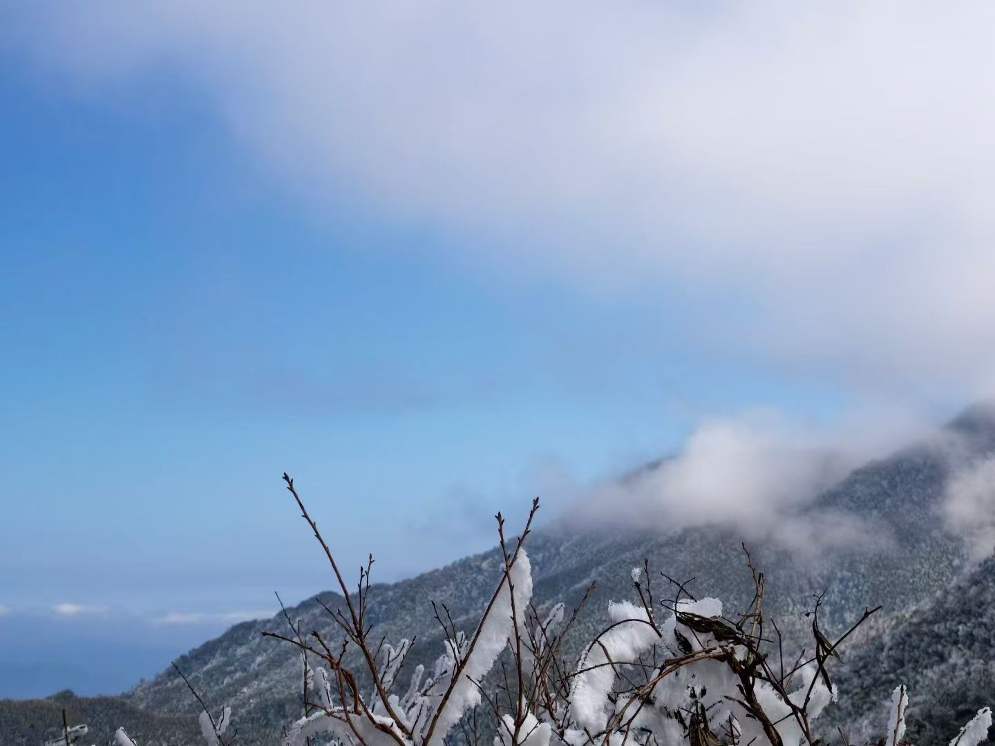 ✅七星岭主峰(浏阳河源头):雾凇最密最厚,山脊栈道拍全景,石碑处拍特写,清晨常偶遇云海叠雾凇