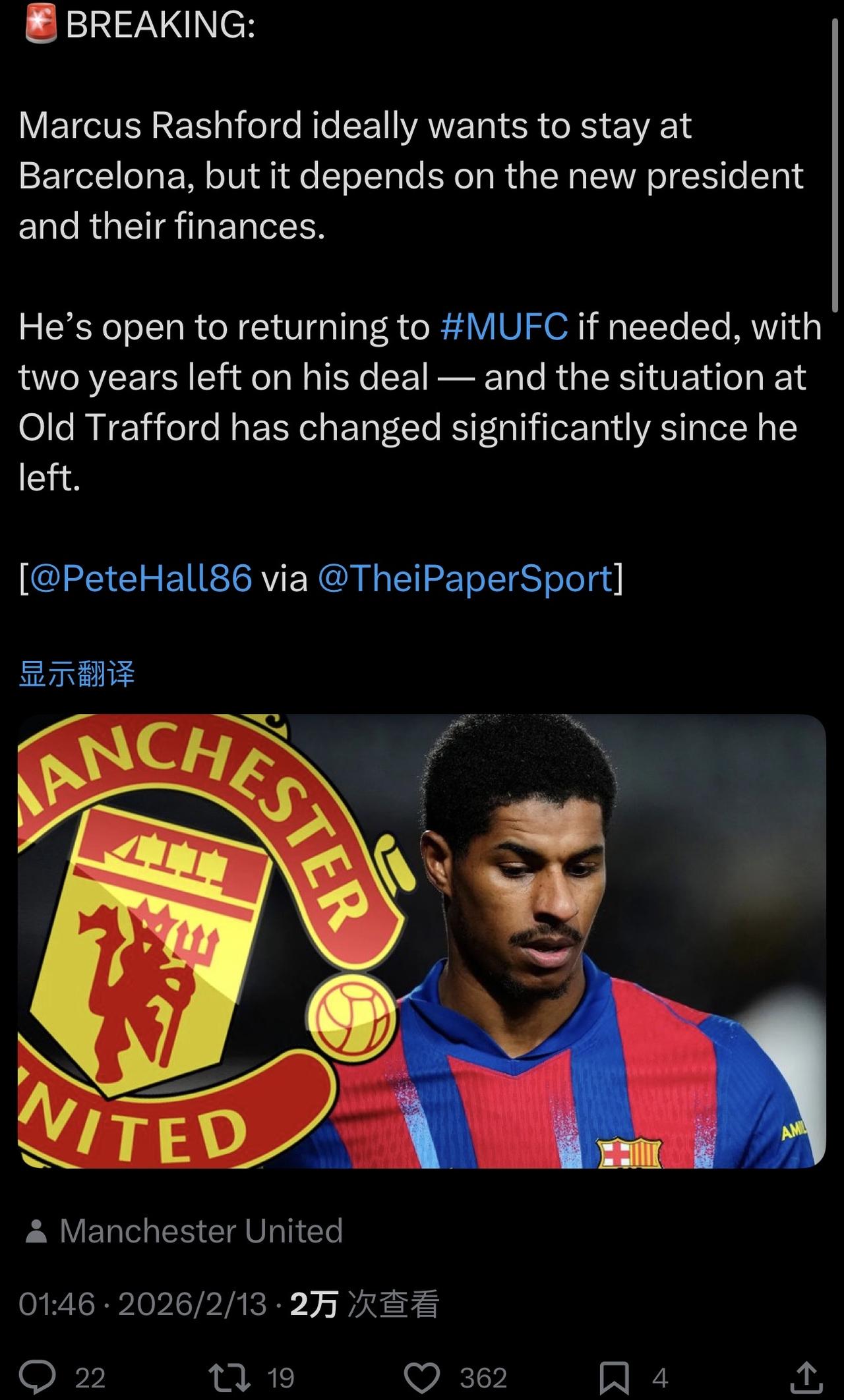 你做好准备回来了,但球迷不一定有这个心理准备啊。 要不拉师傅,你再给球迷2年时间,做做心理建设,然后你再考虑回曼联? ……………………………………………………………… 突发新闻: 马库斯·拉什福德理想情况下希望留在巴塞罗那,但这取决于新主席和俱乐部的财政状况。 如果需要,他愿意重返曼联 ,他的合同还有两年才到期——而且自从他离开老特拉福德以来,那里的情况已经发生了很大的变化。