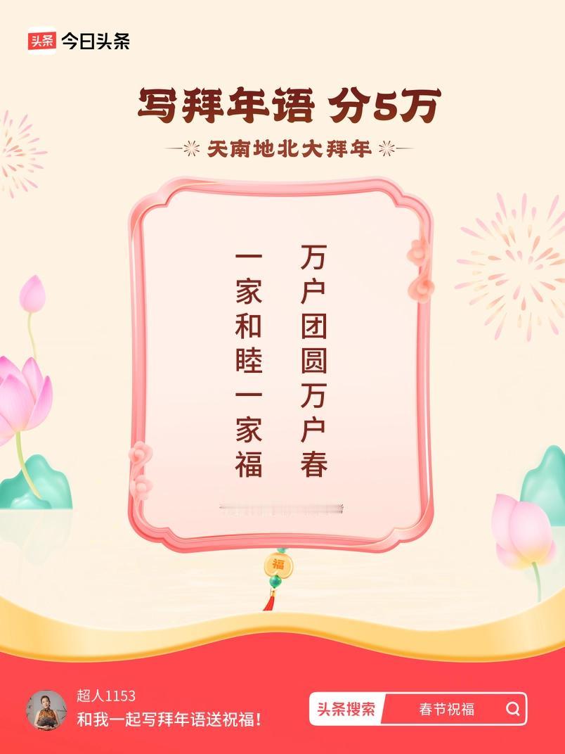 写拜年语送祝福新春拜年送祝福!我的祝福是:“一家和睦一家福,万户团圆万户春”!快来一起写祝福吧戳这里,一起领红包>