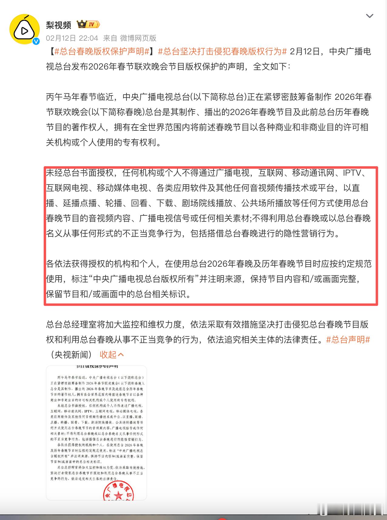 为了春晚的版权,总台不得不出了一个声明:「未经总台书面授权,任何机构或个人不得通过广播电视,互联网、移动通讯网、IPTV、互联网电视、移动媒体电视、各类应用软件及其他任何音视频传播技术或平台,以直播、延播点播、轮播、回看、下载、剧场院线播放、公共场所播放等任何方式使用总台春晚节目的音视频内容、广播电视信号或任何相关素材。」