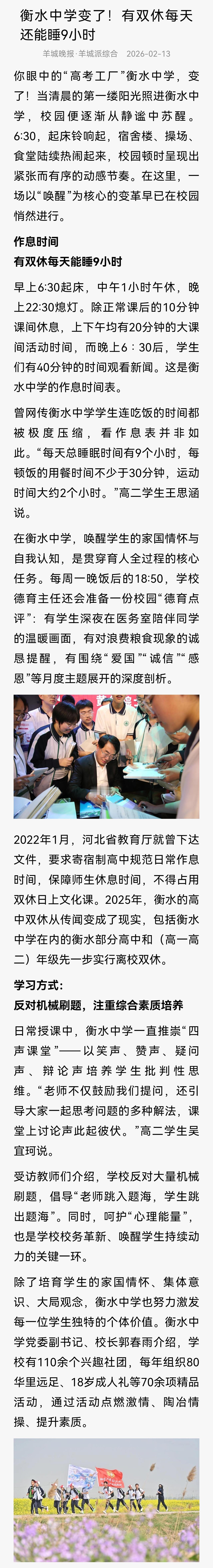 新华社这篇报道“衡水中学变了”,有两点值得关注。 一是报道称,该校作息时间表为:早上6∶30起床,中午1小时午休,晚上22∶30熄灯。除正常课后的10分钟课间休息,上下午均有20分钟的大课间活动时间,而晚上6∶30后,学生们有40分钟的时间观看新闻。按照这一作息表,学生每天睡眠时间9小时,这超过高中生8小时睡眠时间。领先全国大部分高中。 二是报道称,2025年,衡水的高中双休从传闻变成了现实,包括衡水中学在内的衡水部分高中和(高一高二)年级先一步实行离校双休。此前有网友反映,河北高中并没有真正实施高中双休,还是高中单休(或学生双休日到校自习)。 那么,如果衡水中学都能做到学生每天睡觉9小时,并实行高中双休,其他学校有何理由做不到呢?