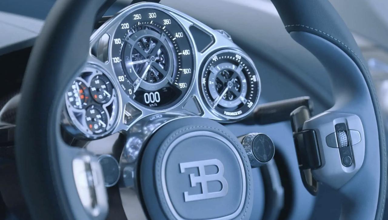 真正的机械艺术品,布加迪陀飞轮内饰 即使在超高端奢侈品领域,很多汽车制造商也认为大屏幕是终极必备品,比如最近发布的奔驰新S级,但是布加迪却努力证明,机械之美才是真正的奢华。 布加迪陀飞轮的仪表盘由布加迪和专注于制造高精度机械腕表机芯的公司瑞士Concepto合作开发,正如这款车的名字,没有像其他布加迪车型采用赛车手命名,“陀飞轮”本身就是1801年获得专利的制表业机械装置,用于抵消重力带来的误差。 这款车的仪表盘由超过650个独立部件组成,纯手工组装,当然和腕表不同,这款车的仪表盘是超大号腕表,还要承受车规级的测试,比如剧烈的温度变化、振动和加速。 从选材来看,仪表盘也堪称顶级,表盘可选巴黎钉纹、玑镂纹和格纹等传统腕表设计的经典元素,红宝石轴承可减少机芯内部的摩擦,而蓝宝石水晶则保护着裸露的部件。【来自懂车帝车友圈】