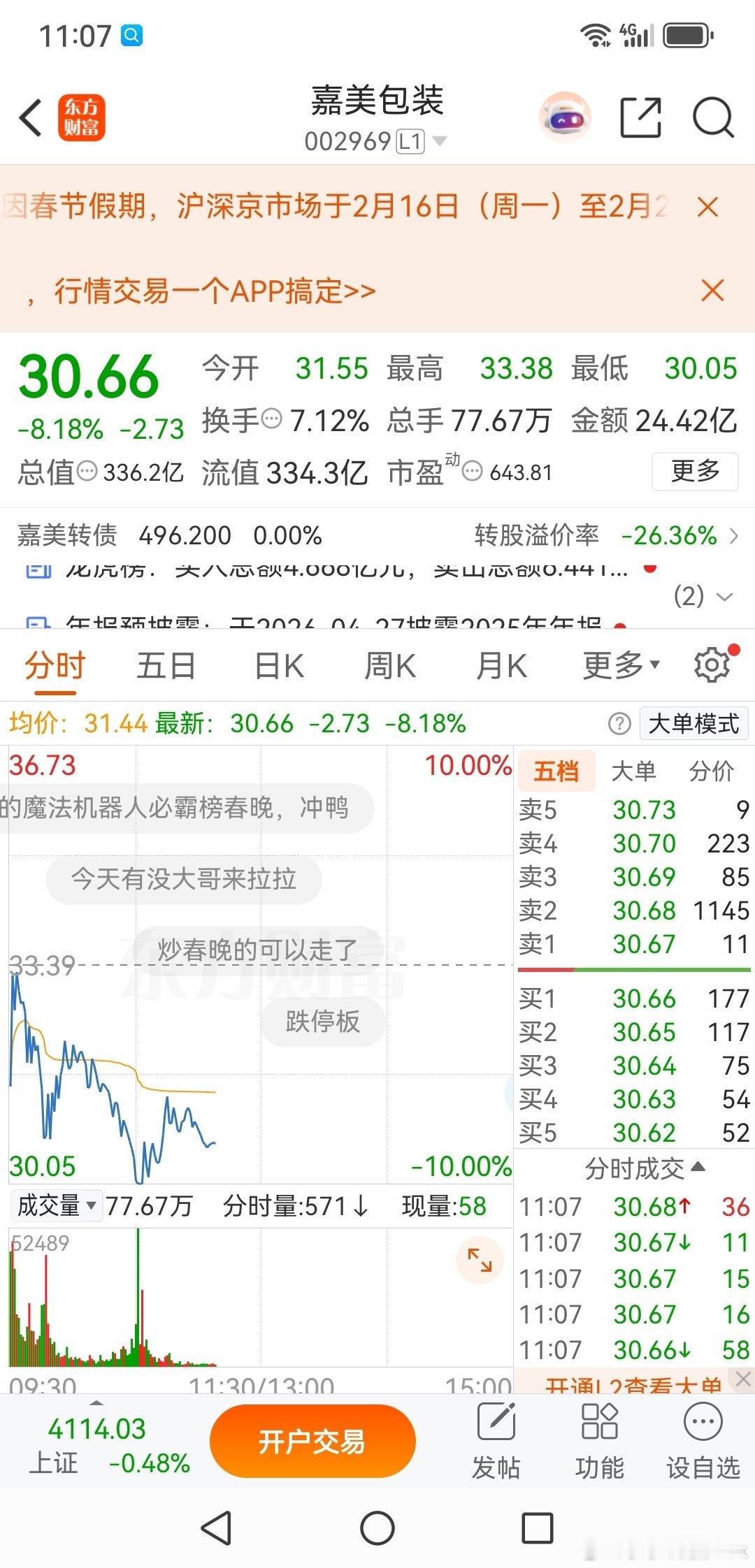 嘉美包装,疲态已显,还是有人承接的,估计还要在上面荡几天,时间肯定是倒计时了。财经股票