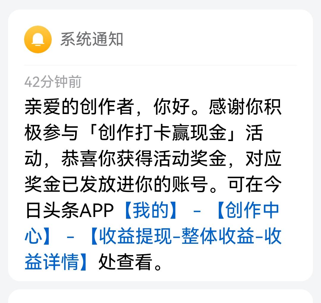 刚刚又收到了一笔奖励,是以前带的一个话题。 创作打卡赢现金。 奖励有10块钱,真的是很好。 所以说,以后我们在创作的时候,应该多参加一些活动。 参加活动赢现金,有时候有意想不到的收获,可能比写文章还来的实际。 每一份耕耘,都有一份收获。 希望2020年能够在头条平台上面创作出更多更优质的作品,能够收获更多的粉丝关爱,能够收获到更多的收益。 我们大家都是头条的一份子,只有天天努力的创作,才会有期望中的收获。