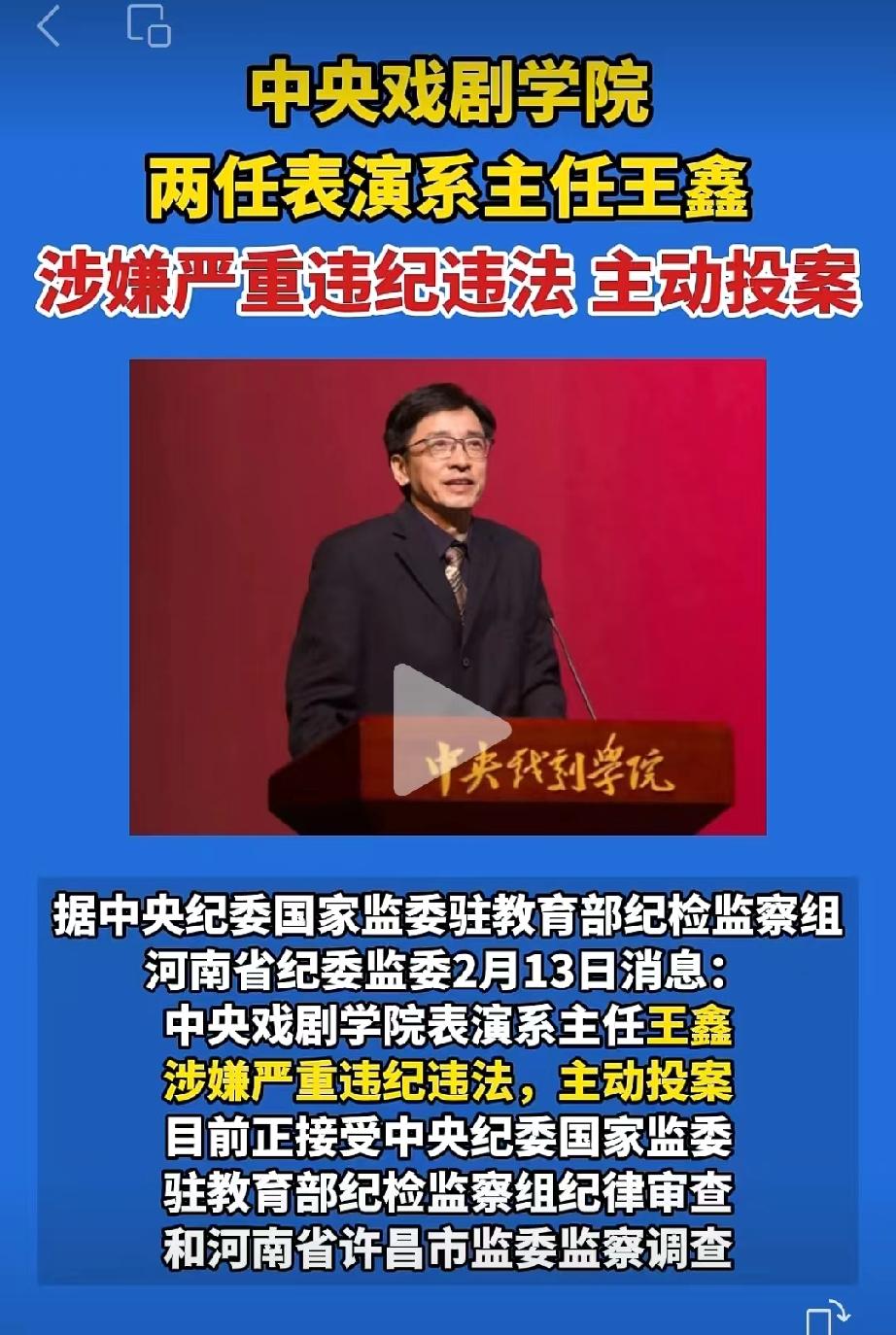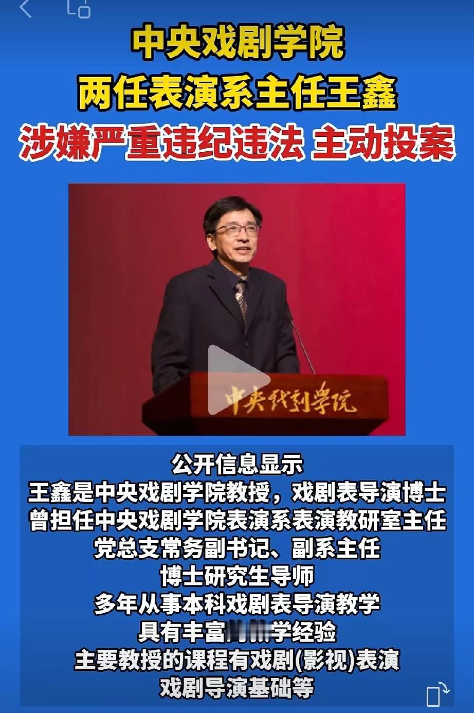 拔出萝卜带出泥?中戏院长郝戎落马不到三个月,中戏表演系主任王鑫今日被查。 这个王鑫也不简单,相信平日里看电视剧的网友应该有印象。 他曾经在多部热播剧中扮演重要角色。 比如电视剧《大江大河》中的徐县长。 《战火中的青春》中的赵忠尧。 每一个角色都是耳熟能详,正所谓演而优则教。 王鑫不仅是一名演员,而且还是中央戏剧学院的教授,博士生导师。担任过中央戏剧学院表演系的主任。 他作为中央戏剧学院教授、博士生导师,长期从事戏剧表导演教学,曾担任表演系表演教研室主任、党总支常务副书记、副系主任等领导职务,培养过易烊千玺、李兰迪、胡先煦、罗一舟等知名演员,2019年获第三届北京市高等学校青年教学名师奖。他同时活跃于影视领域,参演过《风筝》《大江大河》《无问西东》《生万物》等作品,并导演《圣井》《萨勒姆的女巫》等话剧。 本来已经身居高位,在演艺圈里面地位颇高,没想到依旧按捺不住内心的贪腐欲望,栽倒在了任上,真是令人唏嘘。