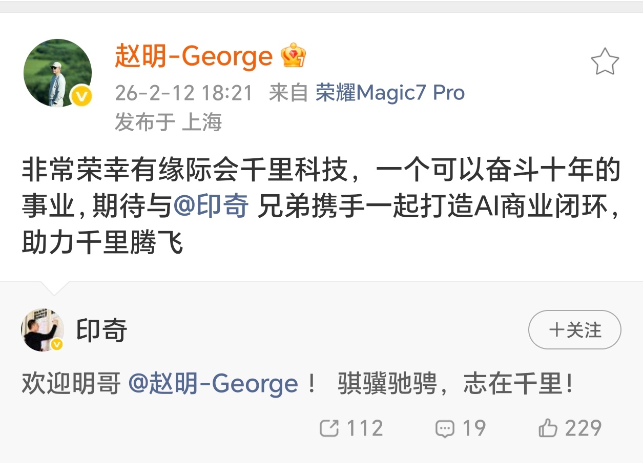 赵明离开荣耀后,大家之前有不少猜测,目前官宣了,加入了千里科技!专注AI