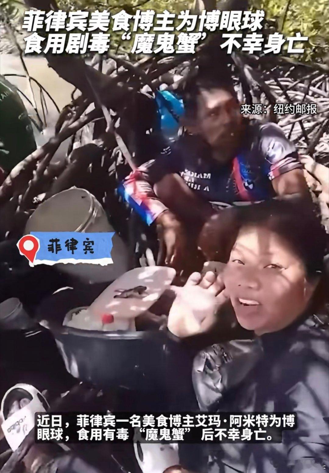 为拍视频误食“魔鬼蟹”!菲律宾51岁美食博主中毒身亡。