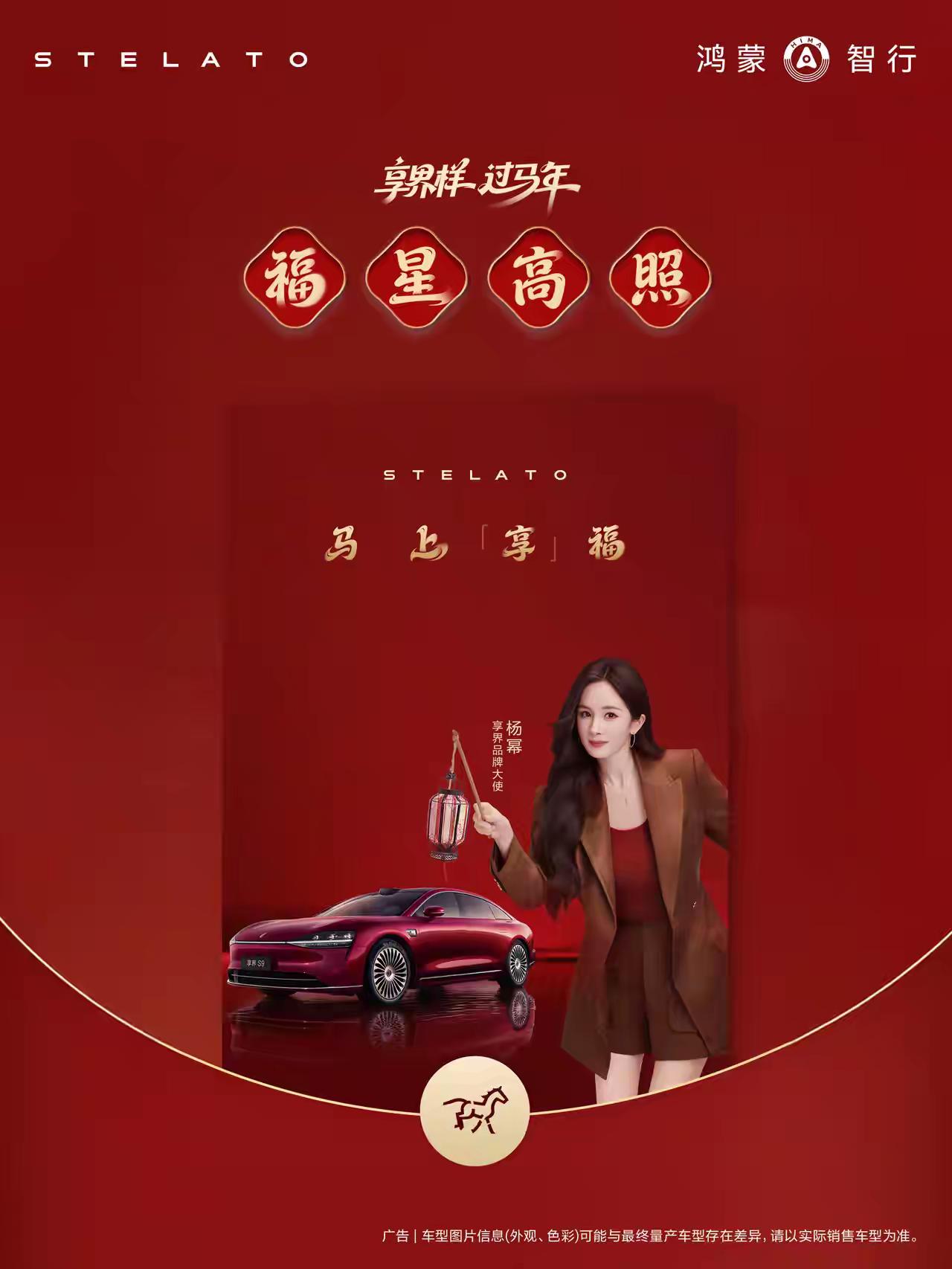 【鸿蒙智行×享界STELATO 马年新春贺岁海报】 🏮 福启新岁·马上“享”福 🎨 视觉核心: - 背景:浓郁中国红打底,融入暗金色“福”字云纹,底部以奔跑的金色小马图案串联,寓意“马年奔腾,福运绵延” - 品牌标识:左上角“鸿蒙智行”金色立体字,右下角“STELATO”银灰色金属质感LOGO,保留科技感的同时呼应传统 - 主视觉:杨幂(享界品牌大使)身着棕红色羊绒大衣+同色系高领内搭,搭配黑色皮质短裤,手持传统宫灯立于红色享界轿车前,灯穗随风轻扬,与车身流线型设计形成动态呼应 🚗 产品亮点呈现: - 车型:享界S9全新红色定制款,车身以24K金丝线勾勒腰线与轮毂,前脸“星辰之眸”大灯组与杨幂手中灯笼光芒交相辉映 - 细节特写:副驾车窗半降,露出内饰的“福”字刺绣头枕;后备箱微微开启,露出装满年货的红色礼盒,传递“享界载福”的温情 📝“享界 过马年”采用书法字体,笔触带出马蹄奔腾的动感 - 副标题:“福星高照”以立体烫金工艺呈现,下方小字“鸿蒙智行 智启鸿运” - 品牌口号:“马上‘享’福”置于海报底部,与奔跑的小马图案形成视觉闭环,暗喻“科技让幸福加速抵达” ✨ 氛围营造: - 光效:车顶洒落金色光斑,模拟烟花绽放效果;杨幂发丝间点缀细碎金粉,呼应“福星”主题 - 道具:宫灯内嵌LED屏滚动播放“2026 丙午马年”,传统与现代巧妙融合;车头悬挂迷你中国结挂饰,细节处彰显年味 🎯 传播价值: 1. 情感共鸣:将“春节团圆”与“智能出行”结合,传递“享界陪你温暖归家”的品牌温度 2. 科技赋能:通过金色线条、光效细节,强化鸿蒙智行“高端智能”定位 3. 明星效应:杨幂的时尚造型与传统文化元素碰撞,吸引Z世代关注 4. 文化传承:小马图案取自敦煌壁画《八骏图》变体,展现品牌文化底蕴 🔖 隐藏彩蛋: 海报扫描二维码可进入AR互动——用户上传照片即可生成“驾享界过马年”动态贺卡,车尾灯会显示定制祝福语,增强传播趣味性