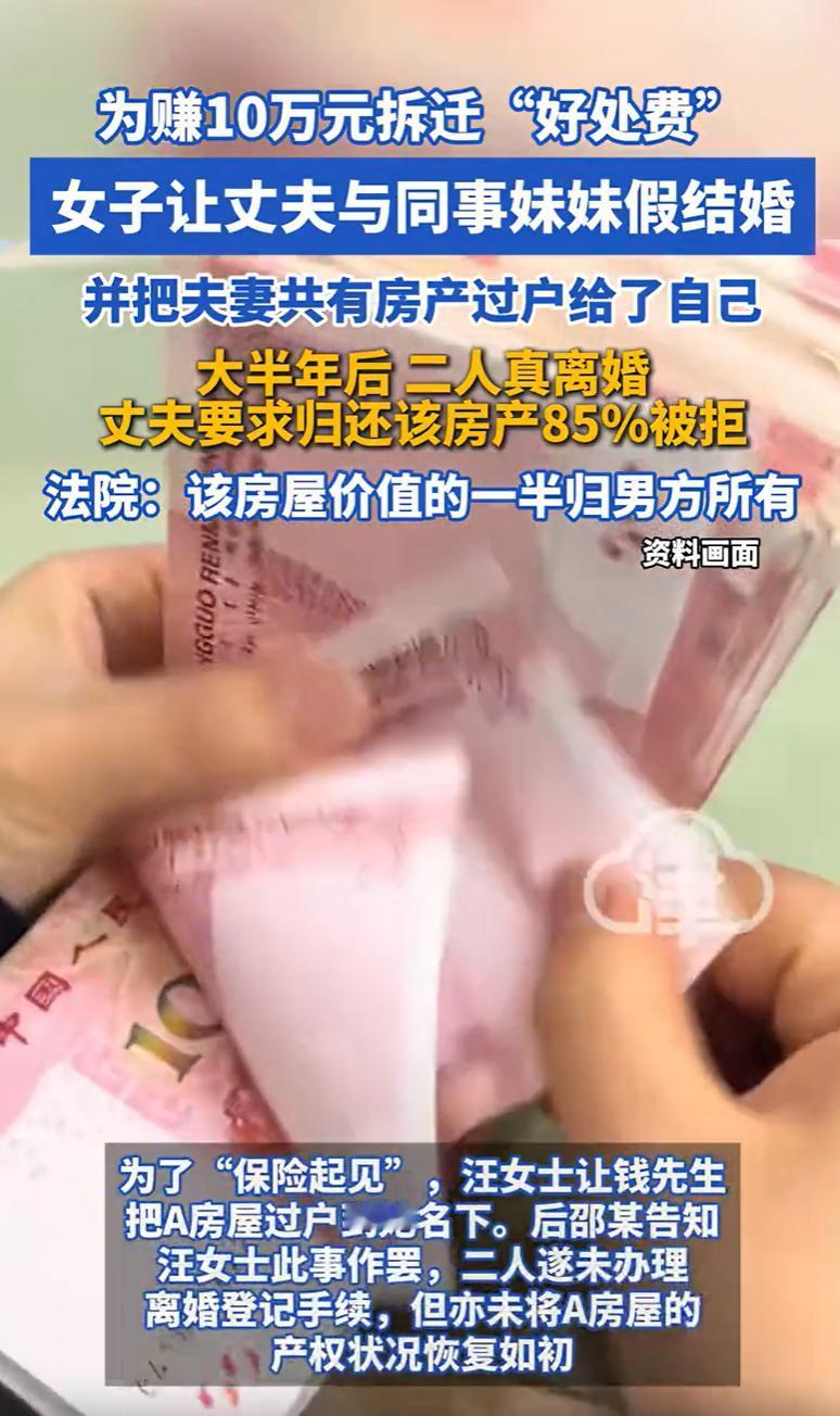 安徽无为,一女子听男同事说,找个单身汉跟他妹妹假结婚,拆迁能多拿一份人头费,事成给十万酬劳。女子心动了,回家跟丈夫商量,两人先假离婚,丈夫和男同事的妹妹去结个婚,钱到手就复婚。怕丈夫变卦,女子让丈夫把套婚前房子全过户给她。丈夫签了字,两人当天上午办过户,下午交离婚申请。不料,男同事那边突然黄了,婚没结成,钱也没影。夫妻俩日子照过,离婚申请过期作废,但房子却给了女子。后来,妻子起诉真离婚,还要分丈夫另一套房。法庭上,丈夫翻出旧账。法院这样判决。 据悉,汪女士和钱先生在2019年就结婚了,一直相安无事,钱先生还把自己一套婚前A房产登记在夫妻两名下。 2024年5月,汪女士听到同事邵某说起拆迁的事,心里就像被猫抓了一下。 邵某说,他妹妹那边拆迁,按人头补偿,只要找个单身男人假结婚,多一个人头就能多拿一份钱。 事成之后,牵线的人给十万酬谢,十万块,不是小数目,汪女士那几年在厂里流水线上站着,一个月到手也就四千出头,十万块顶她两年的工资。 她晚上躺在床上翻来覆去睡不着,推了推身边的钱先生,把这事说了。 钱先生闷了一会儿,说:假结婚?那我跟你怎么办。 汪女士说:咱们先假离婚,你去跟邵某的妹妹领个证,等钱拿到手,再离了,咱们复婚。就是走个过场,房本、户口,什么都不耽误。 钱先生没吭声。 汪女士又说:你放心,这事我来安排,咱们先把A房子过到我名下,算是个保障。 钱先生犹豫了两天,还是签了字。 2024年5月,A房屋的产权变更登记完成,汪女士成了这套房子的唯一所有权人。 手续办完的当天,两人就去了民政局,递交了离婚申请。 谁知道邵某那头突然变了卦,他说拆迁政策调整,假结婚的路子走不通了,那十万块的事,作罢。 汪女士又气又泄气,钱先生反倒松了口气。 两人那段时间谁也没再提离婚的事,申请期过了也没去领证,就这么稀里糊涂地把日子过了下去。 但A房屋的名字,还是汪女士一个人的。 钱先生不是没想过这事,有一次吃饭,他试探着问,那房子,什么时候过户回来? 汪女士筷子顿了一下说:急什么,咱们又没真离,我的不就是你的。 钱先生没再追问,心想夫妻之间,不至于。 可他没想到,2025年3月,汪女士一纸诉状递到了法院,要求离婚,并要求分割钱先生名下另一套B房屋。 钱先生拿着传票,站在法院门口愣了半晌,他同意离婚,也同意把B房屋分一半给汪女士,但不认可A房屋的分配。 这套房子是他自己婚前挣钱买的,怎么就变成汪女士一个人的了? 钱先生认为,其对A房子起码该占85%。 汪女士的立场很硬,强调A房产是钱先生赠与给汪女士的,这房子是其个人财产,跟钱先生没关系。 法庭上,钱先生低着头,声音不高,但一字一句说得很慢:“2024年那次过户,是为了骗拆迁款。不是我真想给她的。” 法官问钱先生:你有证据吗? 钱先生说:我们有离婚申请记录,还有邵某后来发消息说事情办不成了。 法官又问汪女士:是这样吗? 汪女士沉默了一会儿说:是,但房子确实已经在我名下了。 法官继续问汪女士:你主张第二次过户是赠与,那你能说清楚,当时钱先生为什么要把另一半产权给你吗?是因为感情好,还是因为别的? 汪女士说:感情好。 法官又问:那为什么同一天你们就去办离婚申请? 汪女士没再回答。 法院会如何判决呢? 《民法典》第六百五十七条规定,赠与合同是赠与人将自己的财产无偿给予受赠人,受赠人表示接受赠与的合同。 法院指出,赠与合同的成立需以赠与人作出真实、自愿的意思表示为核心要件。 本案中,钱先生虽配合办理过户手续,但该行为发生在“为获取拆迁利益而计划假结婚”这一特定背景之下。 证据显示,双方于过户当日即共同向民政局递交离婚申请,该时间节点的高度重合,足以印证钱先生所作产权变更并非基于维系婚姻、增进感情的赠与意图,而是为实现汪女士提出的“以过户作保障、事成后复婚”的临时性安排。 邵某证言及双方陈述亦证实,该安排的目的系为获取非法拆迁补偿利益,具有明显权宜性和条件性。 法院认为,第二次产权变更缺乏赠与的实质意思表示,钱先生所作处分非其真实意愿,相关过户行为应属无效。 不过,A房屋虽系钱先生婚前购置,但第一次变更系其于婚后主动将汪女士登记为共有人,已通过意思自治变更了财产归属,A房屋在第一次变更后成为夫妻共同财产。 《民法典》第一千零八十七条规定,离婚时,夫妻的共同财产由双方协议处理;协议不成的,由人民法院根据财产的具体情况,按照照顾子女、女方和无过错方权益的原则判决。 最终,法院基于照顾女方权益、考虑财产来源等原则,最终酌定双方各占50%份额,并在折抵B房屋分割款后,判令汪女士向钱先生支付差价40936.32元。 对此,您怎么看?