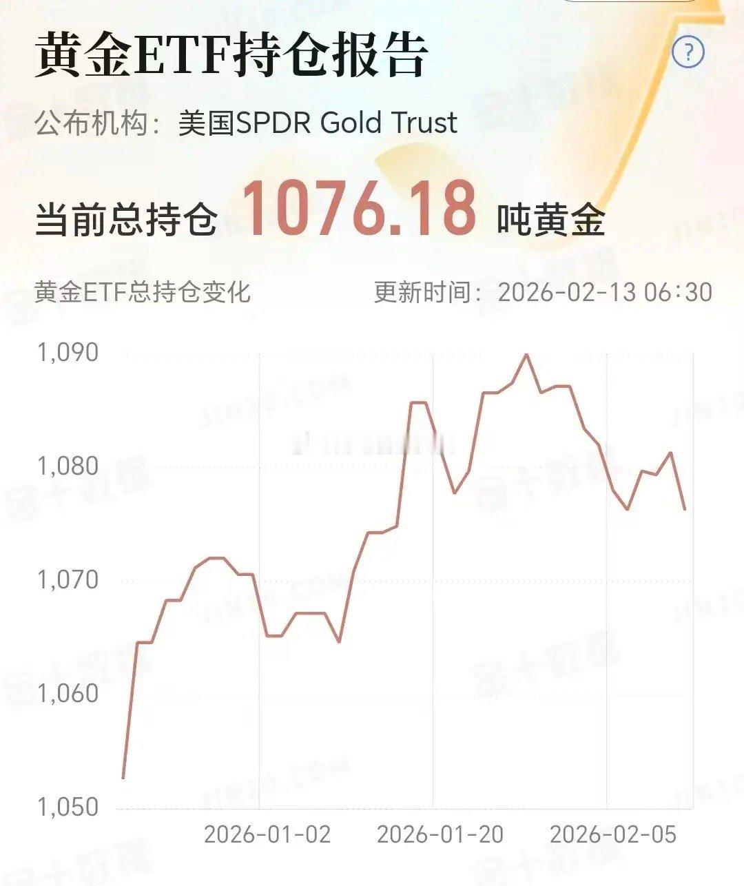 SPDR Gold Trust作为全球最大黄金ETF机构,2月12日持仓较上日减少5.14吨,当前持仓量为1076.18吨。
