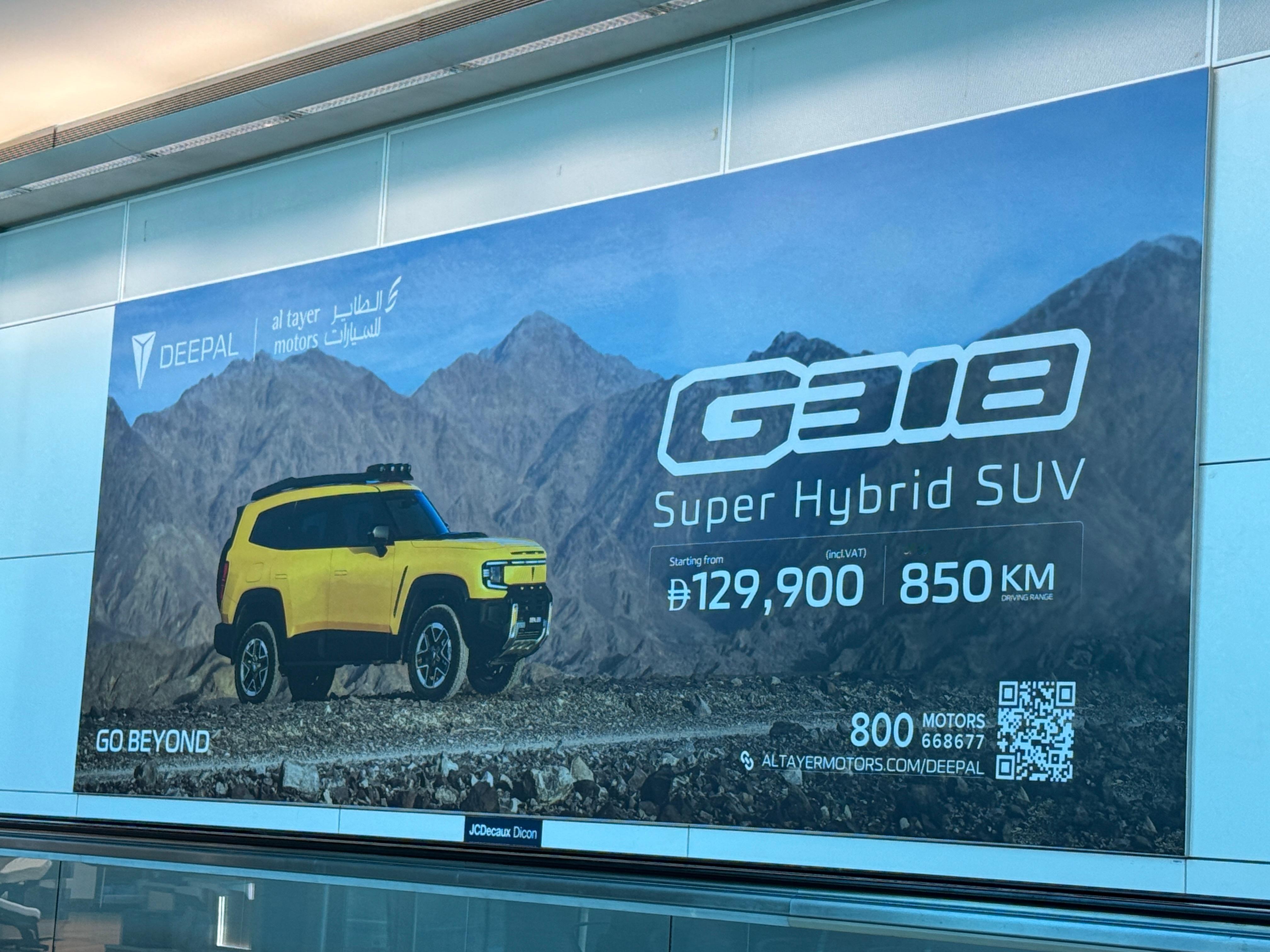 迪拜机场候机看到全是咱国产车的广告牌🪧深蓝G318,在阿联酋代理销售起售价 12.99W迪拉姆(含增值税),折合人民币差不多 24.5W,比国内售价贵个7W元左右,但感觉价格还不错呀,在阿联酋这边应该算也挺有性价比的了,造型应该也是中东大哥们会喜欢的吧卷妹的唠嗑我与汽车的日常 阿联酋·阿联酋迪拜国际机场