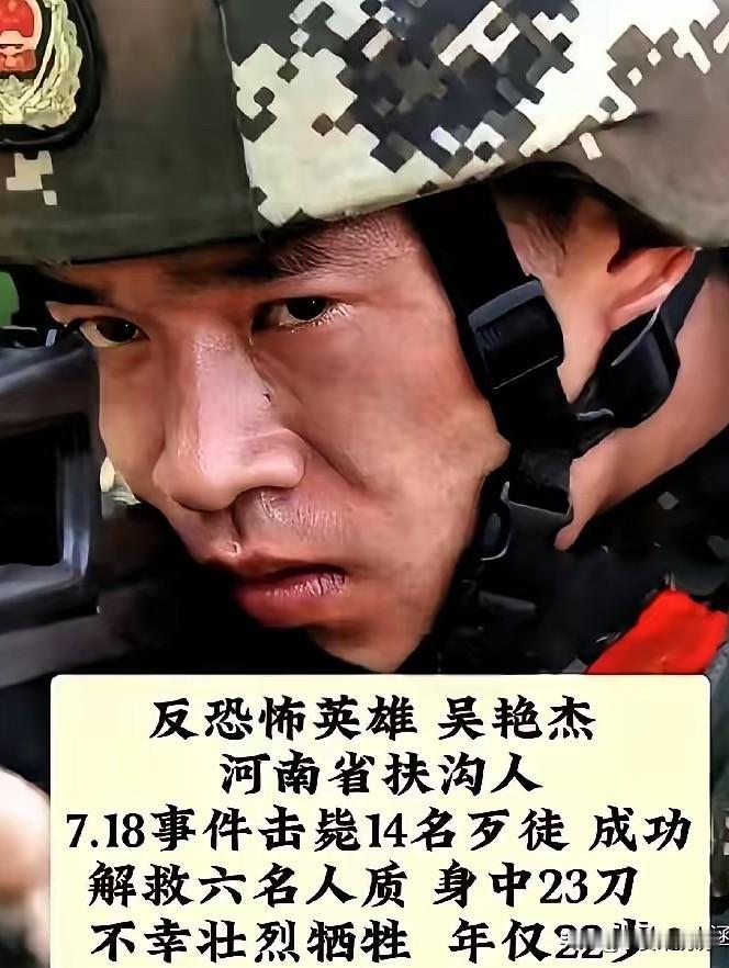 太令人心痛了!河南周口,22岁武警战士吴艳杰,击毙14名暴徒、救下6名人质,身中22刀壮烈牺牲。而他的事迹,转发不过千,点赞不过万。同一天,某明星晒自拍,点赞1200万。 他叫吴艳杰,1989年冬天出生在扶沟一个农家院。 没人知道他冲上去的时候在想什么。没有直播,没有特写,没有后期剪辑,只有刀、血、火,和一个刚入伍两年的年轻人。他不是被安排在镜头前的人,是被推到生死面前的人。22刀,每一刀都扎在看不见的地方,也扎在没人愿意多翻一页的新闻里。 我知道这么说有点偏激,也知道追星和敬英雄不冲突。可数据不会骗人,手指划过去的一秒钟,能决定一条生命的热度,也能忘记一条生命的重量。他用命换回来的平安,我们刷着手机就轻易忘了。 他从河南农村走出去,没来得及谈一场像样的恋爱,没来得及给父母养老送终。家里的土院子还在,人却埋进了烈士陵园。明星的自拍会被存进相册反复看,他的名字,搜一次,少一次。 不是要绑架谁的点赞,只是觉得不公平。有人在黑暗里替我们挡刀,我们却在光亮里忙着给无关紧要的人捧场。英雄不说话,不代表我们可以装聋作哑。 有些名字,不该只活在纪念日里。 你愿意为这位英雄点个赞吗?