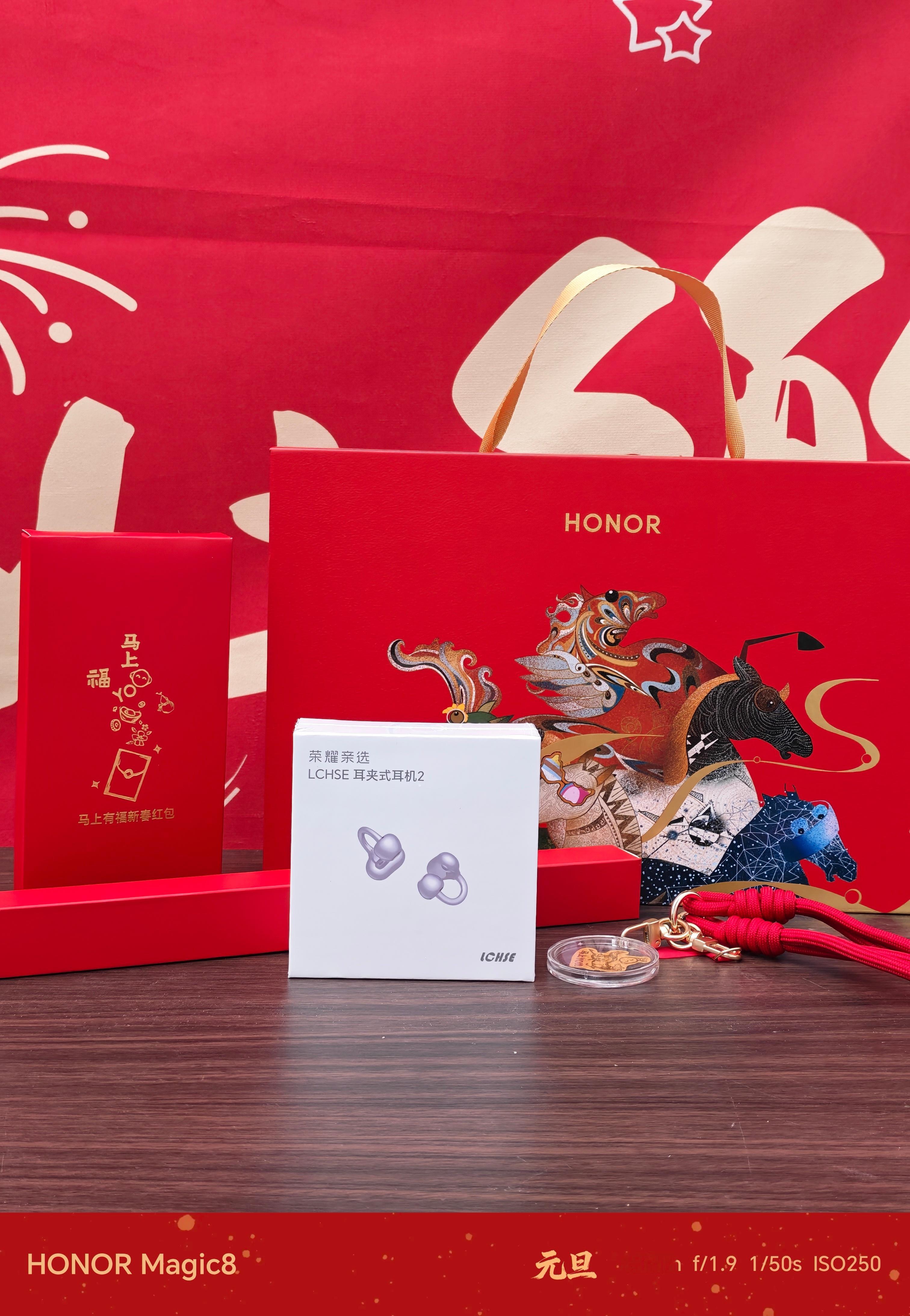 荣耀今年的新年好暖礼盒有荣耀亲选LCHSE 耳夹式耳机2,我正好最爱这个骚骚的莫奈紫~一对春联和红包,还有纯金的手机挂绳,福气这就来了~
