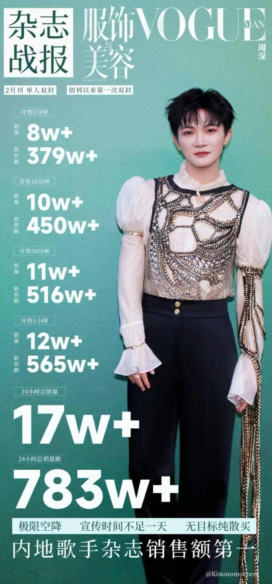 周深VogueMan24小时销售额破783w,是歌手里的销量第一!!几乎是在极限空降情况下达到的成绩