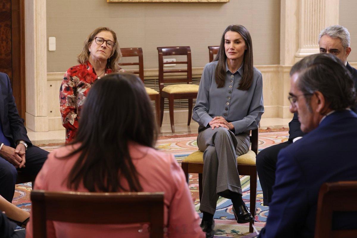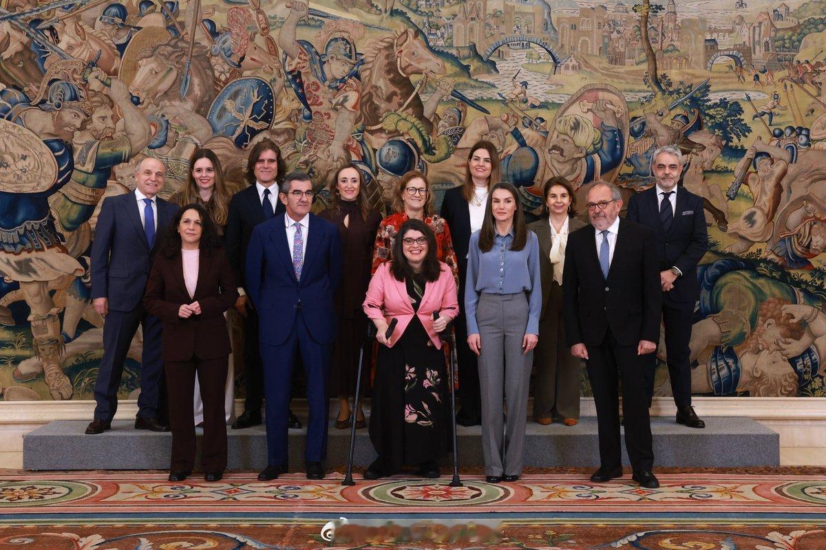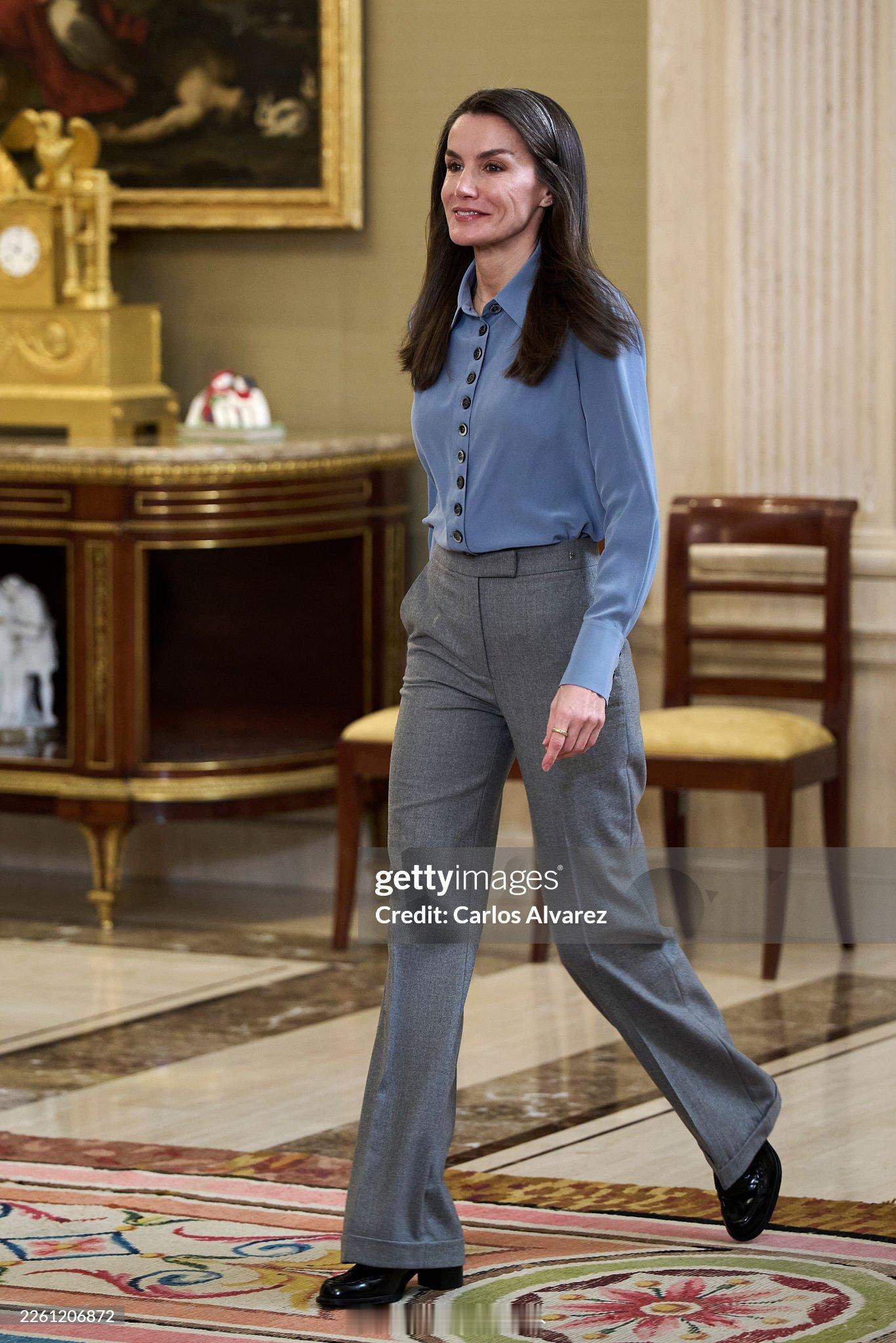 2.12 西班牙王后莱蒂齐亚出席接待会,上衣来自ANTIK BATIK,阔腿裤来自carolina herrera