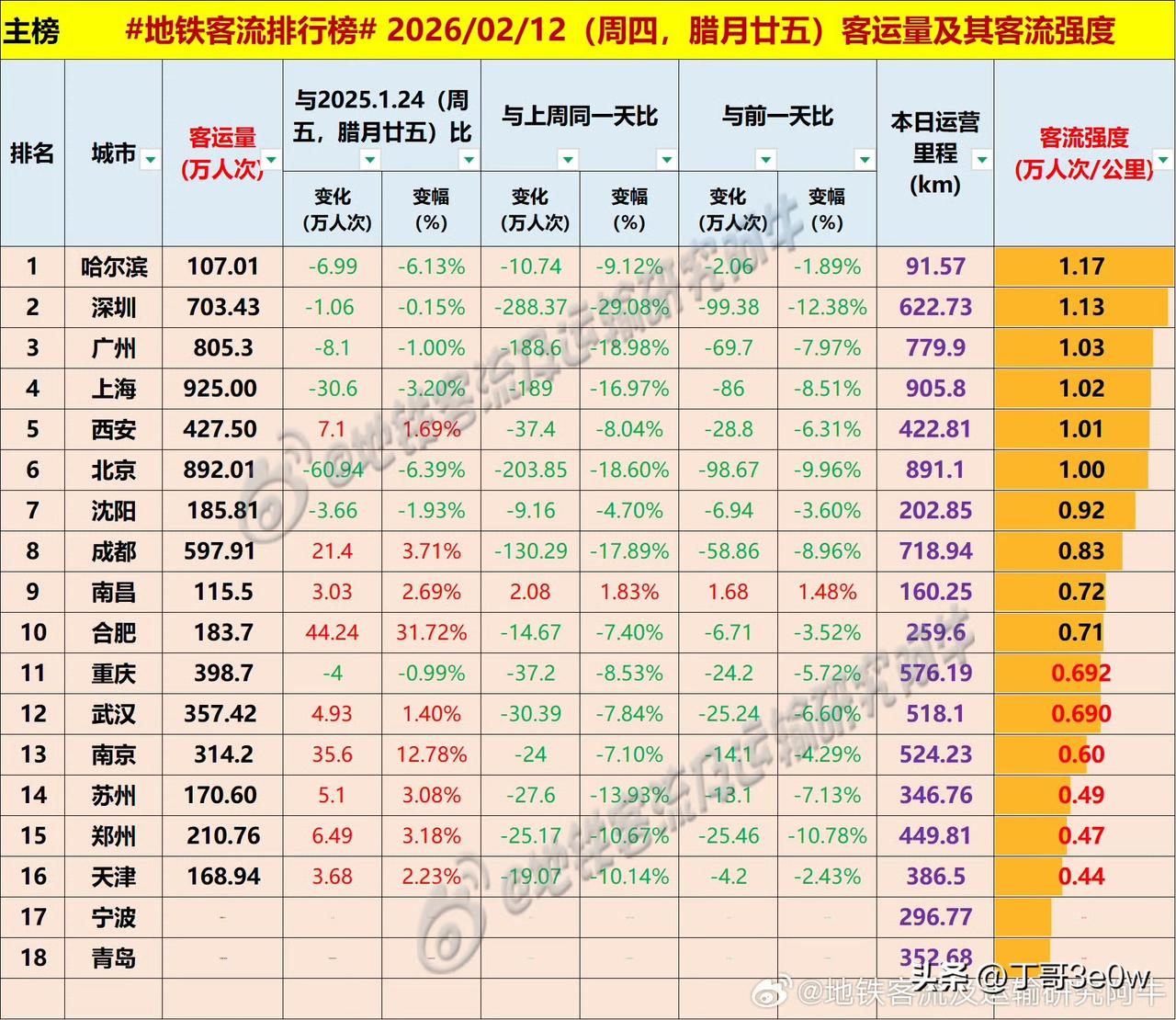 昨日周四,全国无城市地铁客流量超千万人次[呲牙][呲牙][呲牙] 爆料 身边事 中国地铁客流日报 昨日客流 排行榜 周四 春运 2026年2月12日 星期四 全国重点城市轨道交通客流量排行榜: 上海:925.00万 北京:892.01万 广州:805.30万广州地铁 深圳:703.43万深圳地铁 成都:597.91万 西安:427.50万西安身边事 重庆:398.70万重庆身边事 武汉:357.42万 南京:314.20万南京地铁 郑州:210.76万 沈阳:185.81万沈阳地铁 合肥:183.70万合肥地铁 苏州:170.60万 天津:168.94万天津身边事 青岛:115万+青岛爆料 南昌:115.50万南昌地铁 宁波:107万+ 哈尔滨107.01万