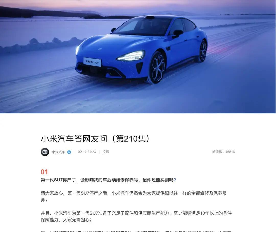 小米直接给出了硬核承诺:维修保养服务跟以前一模一样,配件储备和供应商产能充足,至少撑10年以上,车主完全可以放心开下去。 这么短时间卖出38万多辆,说明产品确实戳中了很多人的痛点,性能强、价格香、智能体验拉满。 停产不等于抛弃用户,这份10年备件保障直接打消了大家的后顾之忧,也让小米在新能源车圈里多了一分靠谱的底气。 新款SU7已经在北京等城市门店亮相,4月就正式开卖,升级后的电池、电机、辅助驾驶更猛,估计又会掀起一波热潮
