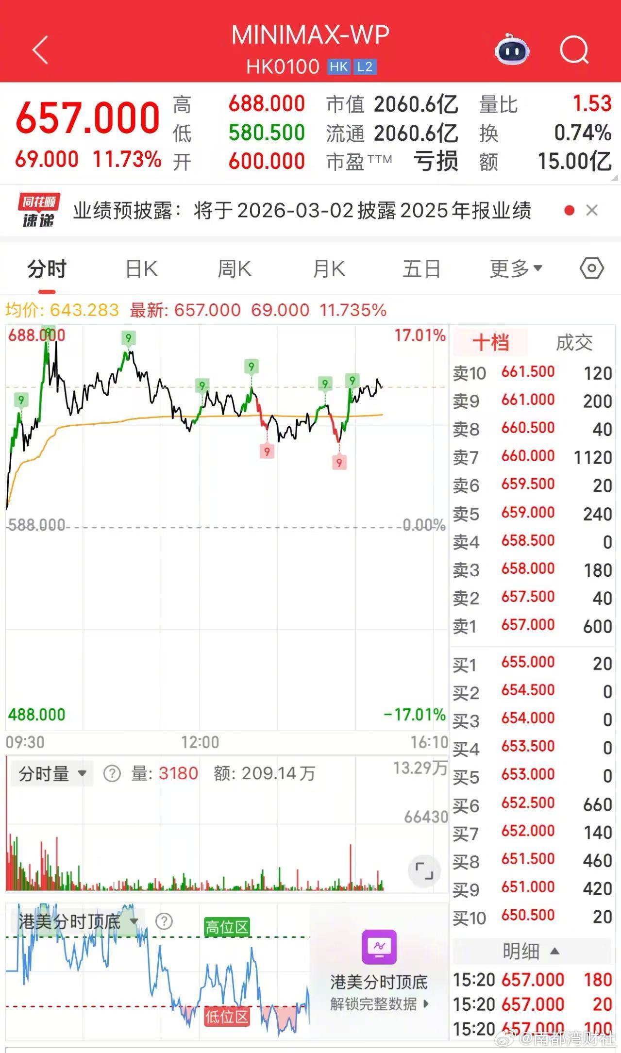 数据显示,模型上线不到一天,来自全世界的用户已经在MiniMax Agent上构建了1万多个AI Agent。截至2月13日午盘,MiniMax股价大涨11.73%,报657港元/股,市值约2060.6亿港元。