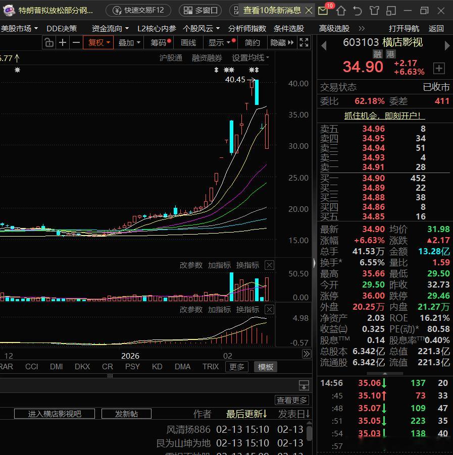 横店影视,节后存在大跌的可能横店影视,今天来了一个准地天板,早上开盘29.5元接近跌停,盘中最高35.66元接近9%的涨幅。今天影视股的集体卷土重来,我认为是2月11日大跌后的一次二次派发行为,影视股昨天的下跌并不是什么洗盘,而是前一天的派发没有成功。影视股炒作的预期是春节长假,所以当春节长假结束后,无论电影票房怎么样,都失去了对股价的支持。横店影视,节后大跌基本上板上订钉的事情,区别是给你跑的,还是不给你跑的机会,这个就要看运气了,今天进来的很难逃被活埋的命运。欢迎加入我们的免费交流群财经股票