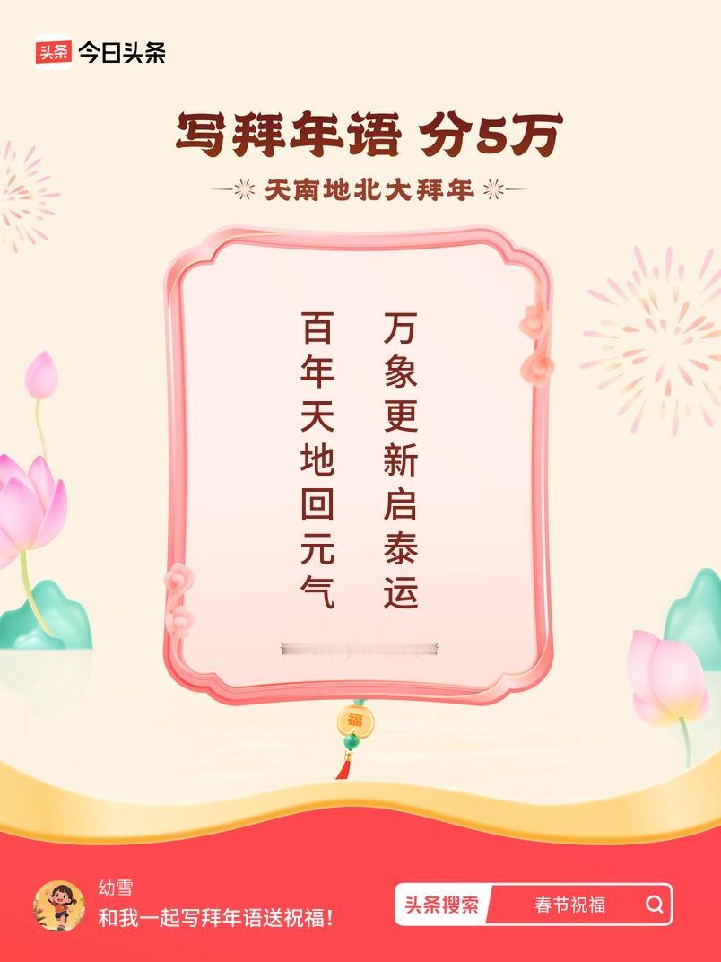 写拜年语送祝福新春拜年送祝福!我的祝福是:“百年天地回元气,万象更新启泰运”!快来一起写祝福吧戳这里,一起领红包>