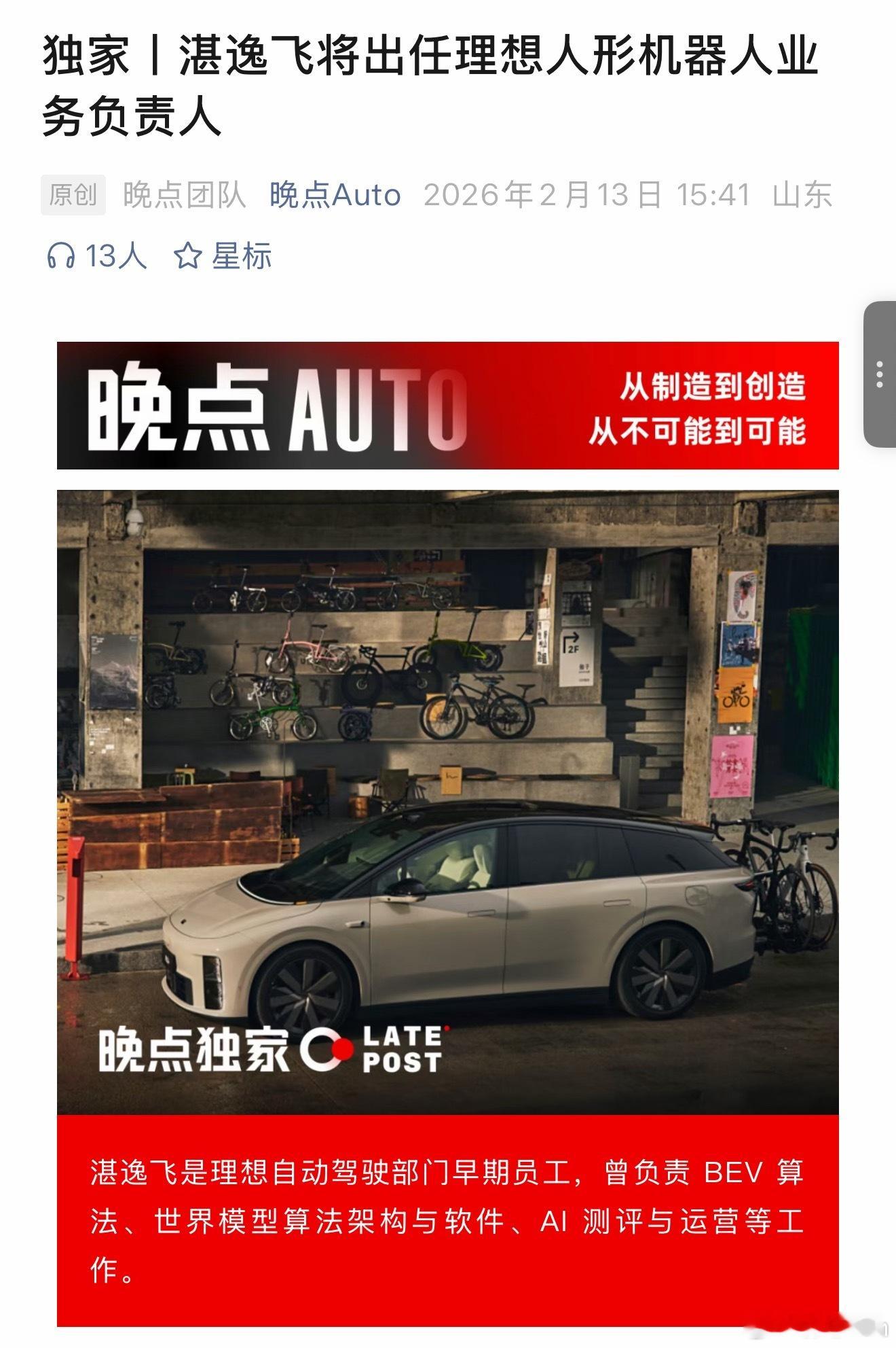 理想汽车自动驾驶高级算法专家湛逸飞将出任人形机器人部门负责人,向智能汽车群组负责人马东辉汇报。
