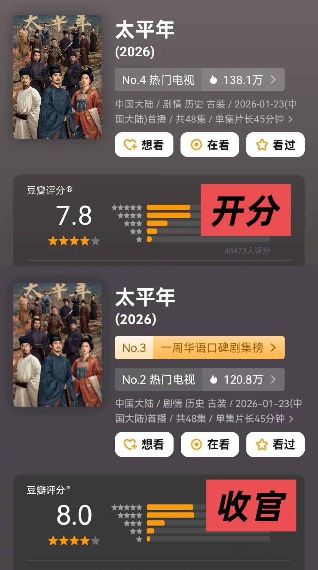 哎,才发现《太平年》播完了,豆瓣开分7.8分→收官8.0分!涨幅+0.2 后劲型选手没爆火但口碑没崩你们追完了没,值不值得补?
