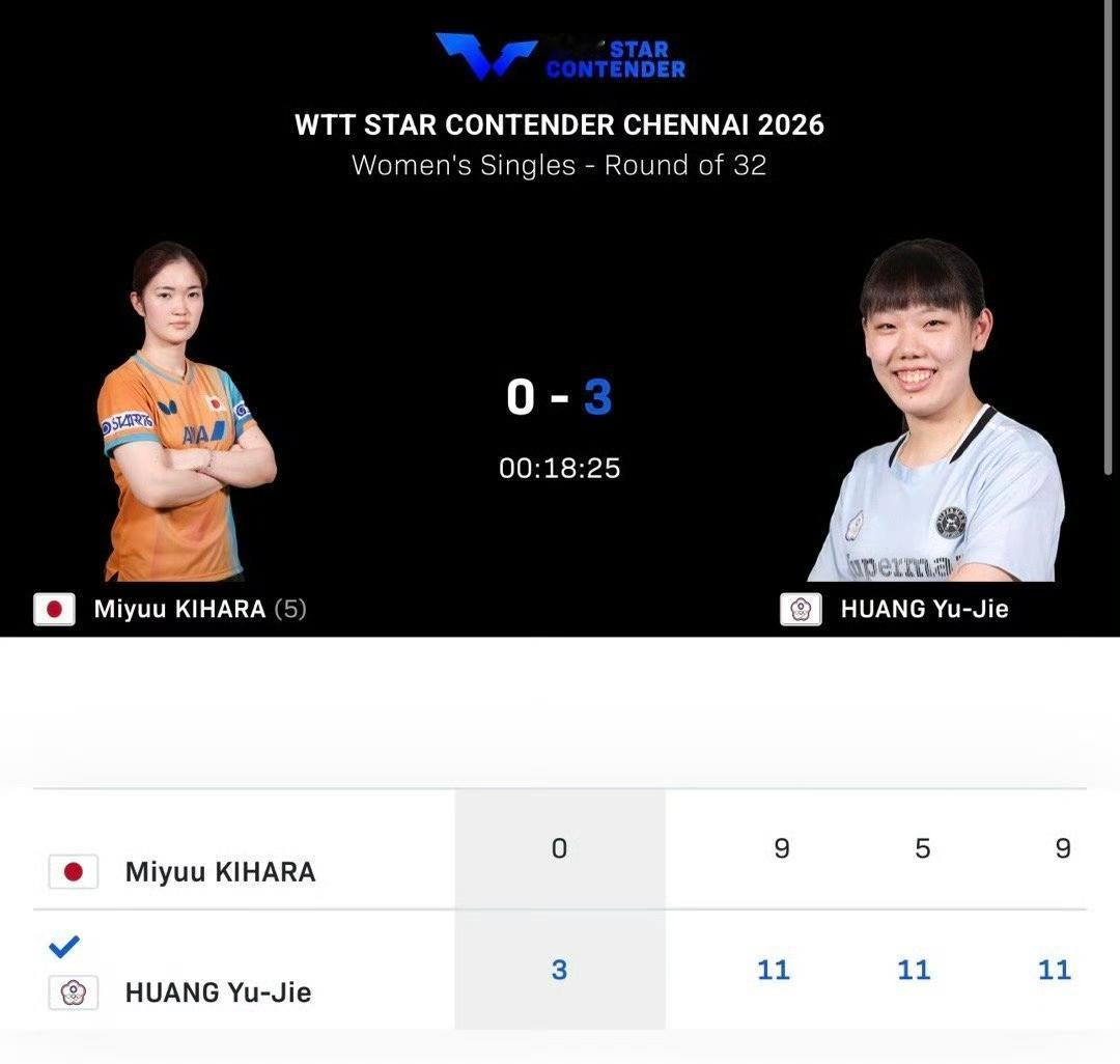木原美悠🇯🇵这是咋了?[奸笑] 刚刚,木原美悠被中国台北选手黄愉倢横扫了,0-3不敌21岁的黄愉倢,止步2026WTT球星挑战赛金奈站女单32强, 三局比分为:黄愉倢11-9,11-5,11-9。 第三局木原美悠还8-3领先 ,领先这么多,最终竟然还是丢了,真的是不宜恋爱啊[捂脸]。 下一轮:黄愉偼VS李恩慧🇰🇷。