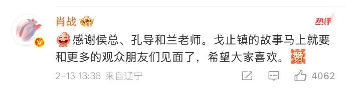 肖战回复侯鸿亮肖战回复侯鸿亮的长文:感谢侯总、孔导和兰老师。戈止镇的故事马上就要和更多的观众朋友们见面了,希望大家喜欢。[赞啊]