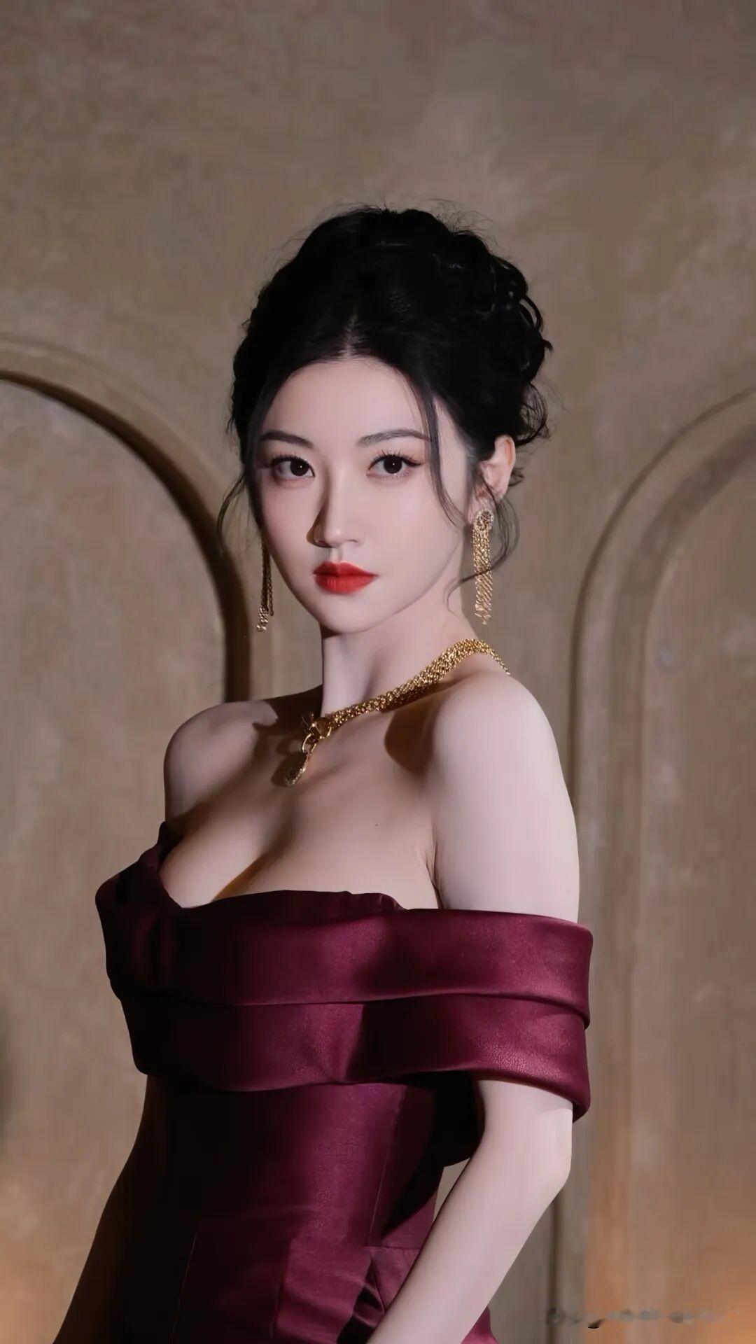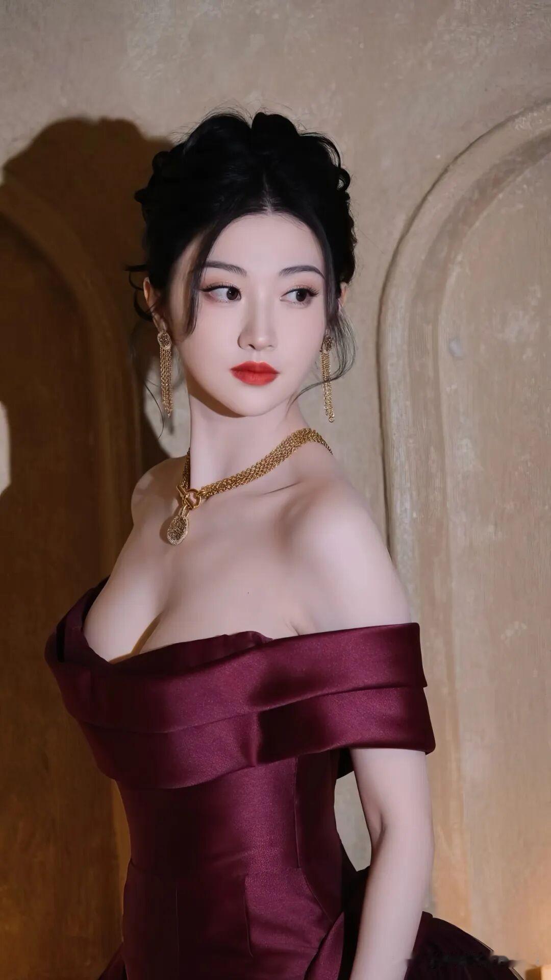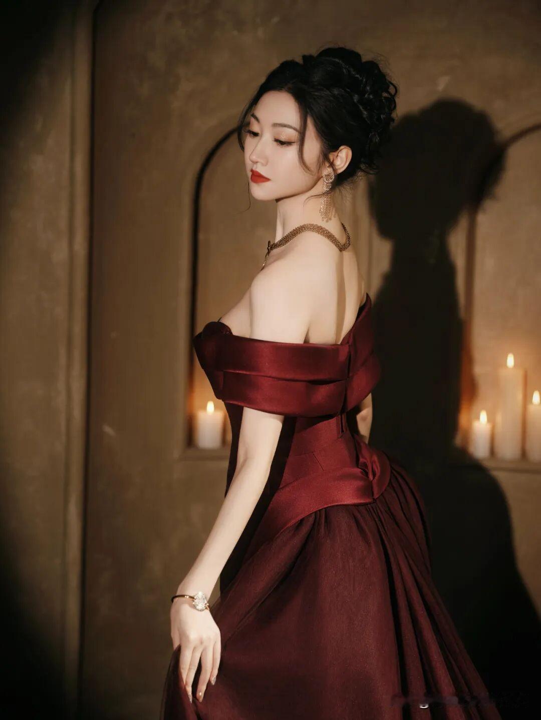 景甜这身酒红色一字肩礼服也太有复古大小姐那味儿了