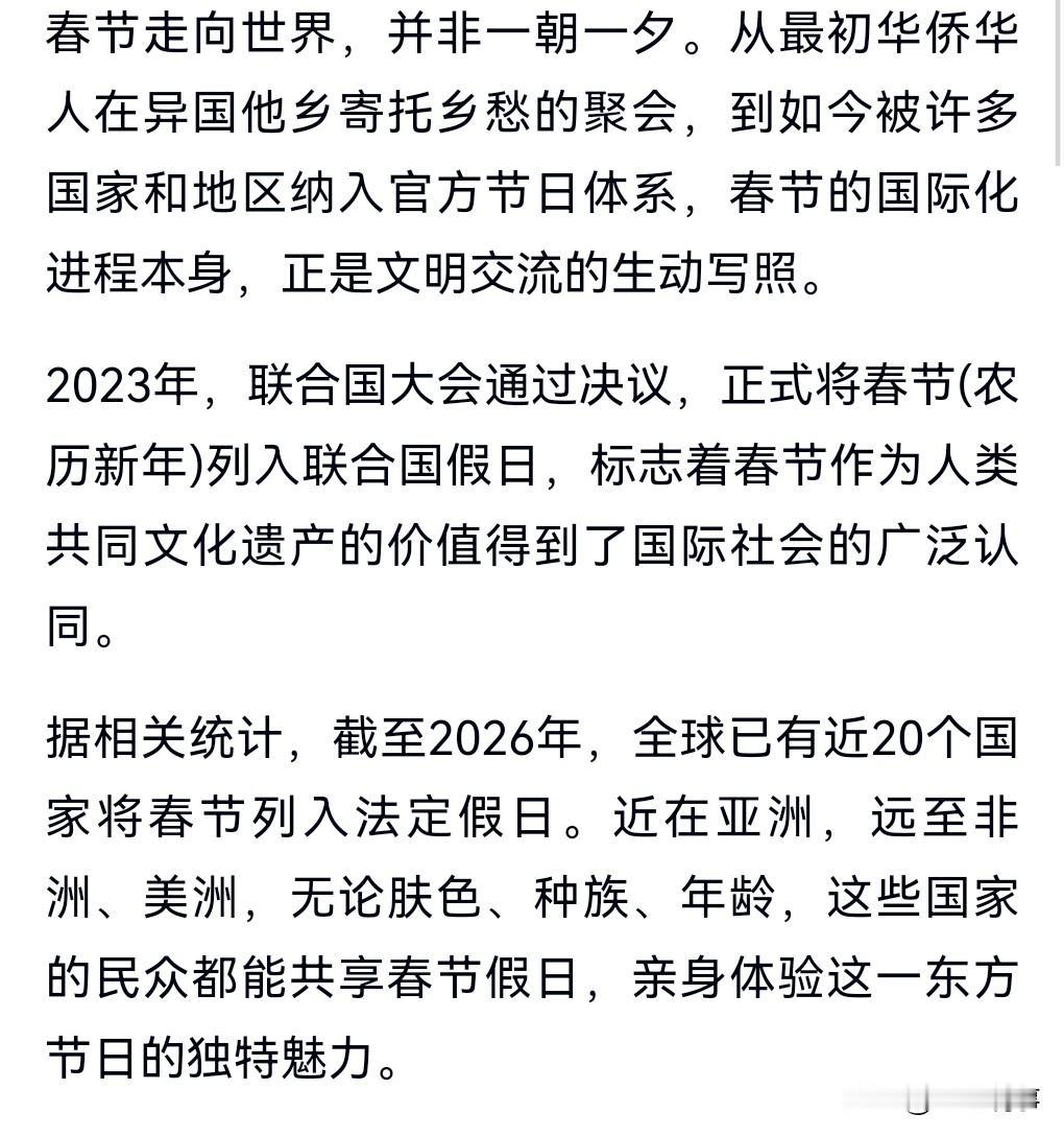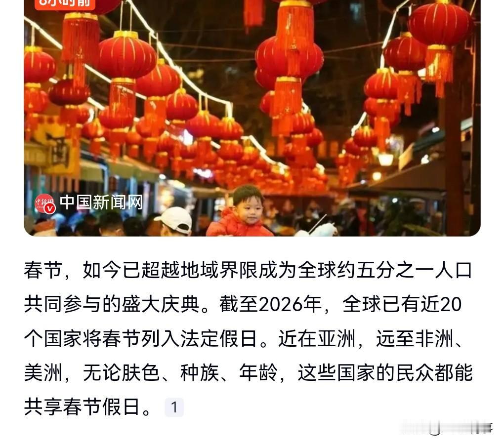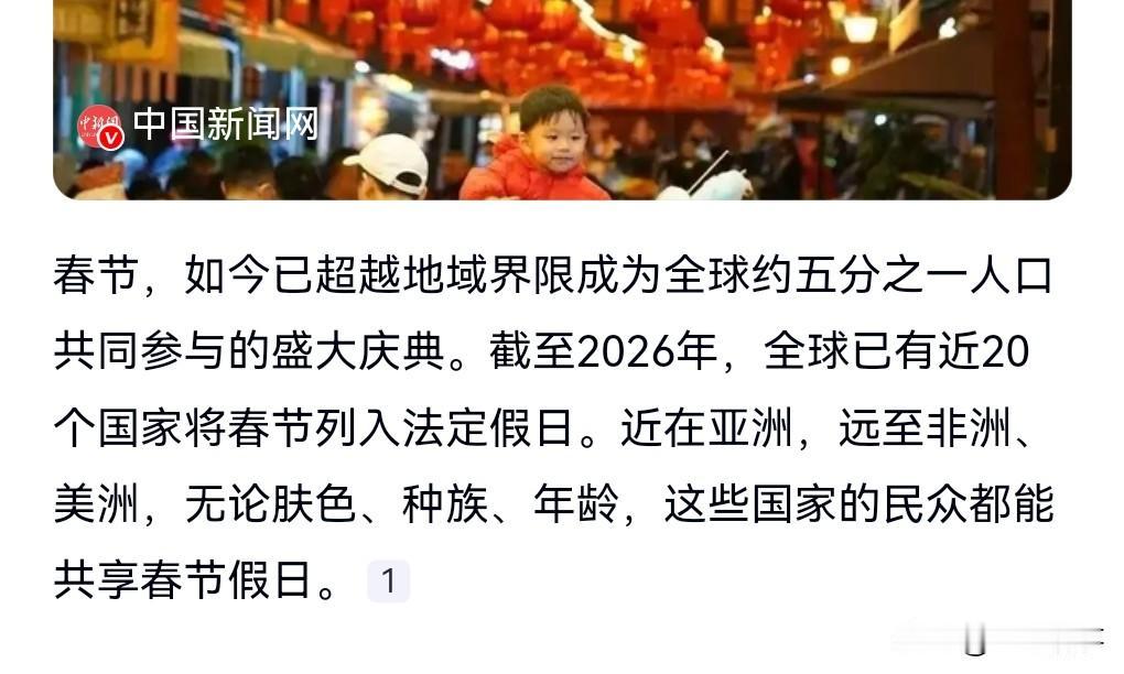 这真的是太厉害了。中国的文化输出相当的给力啊。 春节已经不再是中国独有了,2月13日热搜,已有近20国将春节列入法定假日。 我们不必嫉妒。 反而我们应该高兴,因为他们开始学我们了,他们渴望中国的文化,渴望成为中国人。 这说明中国越来越强大了,我们要保持这种自信。 越多人学我们,我们越要感到自豪,这样我们才会越来越强大。 一个开放的国家是最容易发展的。