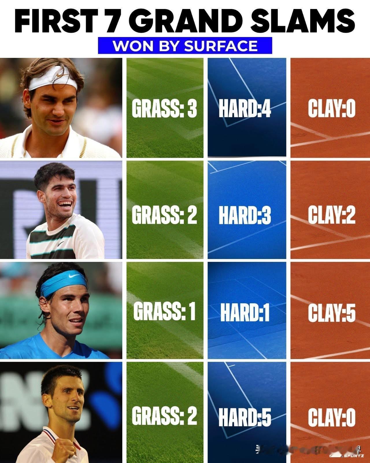 阿尔卡拉斯和三巨头前7个大满贯冠军(按场地类型划分): 费德勒:草地3冠,硬地4冠,红土0冠 阿尔卡拉斯:草地2冠,硬地3冠,红土2冠 纳达尔:草地1冠,硬地1冠,红土5冠 德约科维奇:草地2冠,硬地5冠,红土0冠 费德勒和德约科维奇在草地和硬地上优势明显,而纳达尔的红土几乎无敌,正因为这种互相牵制,三巨头都没能均衡发展。反观阿尔卡拉斯是真的全场地通杀,但不少球迷认为时代太弱,仅有辛纳一个竞争对手,大家认为呢?