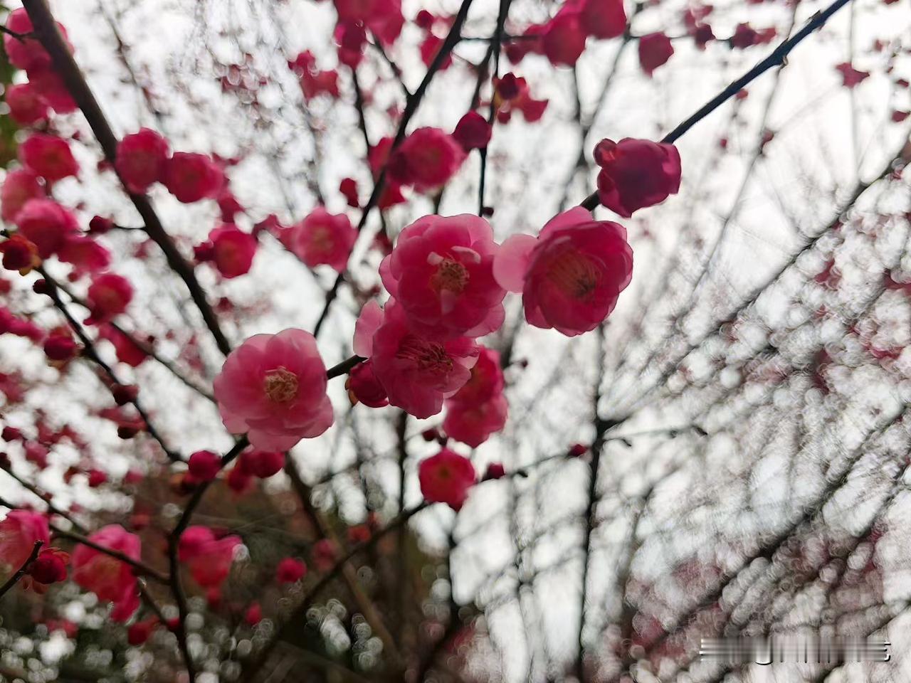 今年冬天的不同梅枝裹着艳粉花团,柔瓣叠在浅灰天光里,风过便晃出朦胧的红。连疏枝都浸着软和的春味,把这抹艳色揉成轻软的诗。