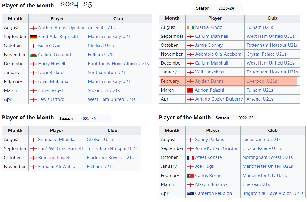 利物浦青训 恭喜莫里森当选英超U21联赛1月最佳球员,上一位获此殊荣的是2年前的丹恩斯