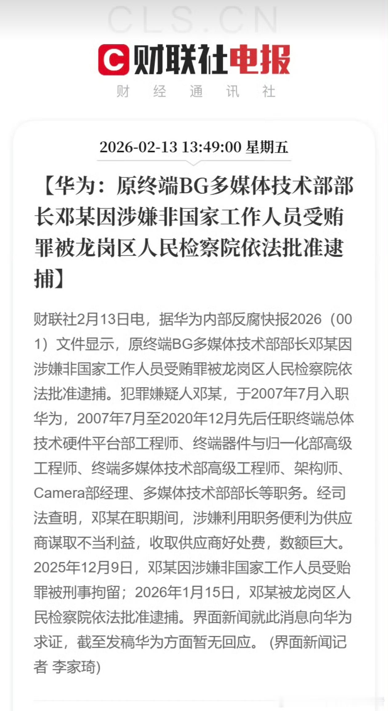 华为内部反腐通报华为内部反腐出重拳,原华为终端BG多媒体技术部部长因涉嫌非国家工作人员受贿罪被批准逮捕。好家伙,这人的职位可不低啊,但这也纯属活该,身在其位却犯了不可饶恕的大错。