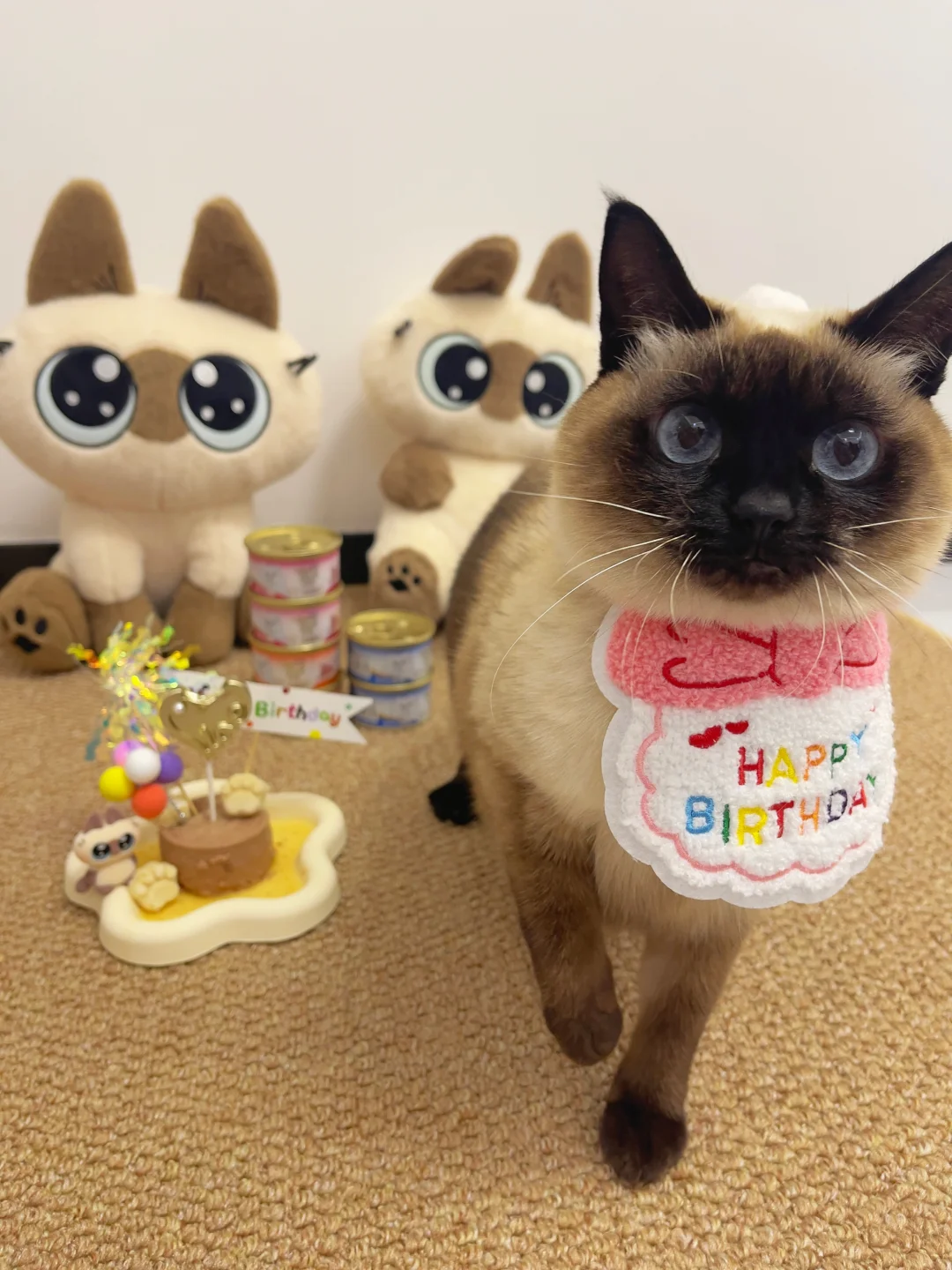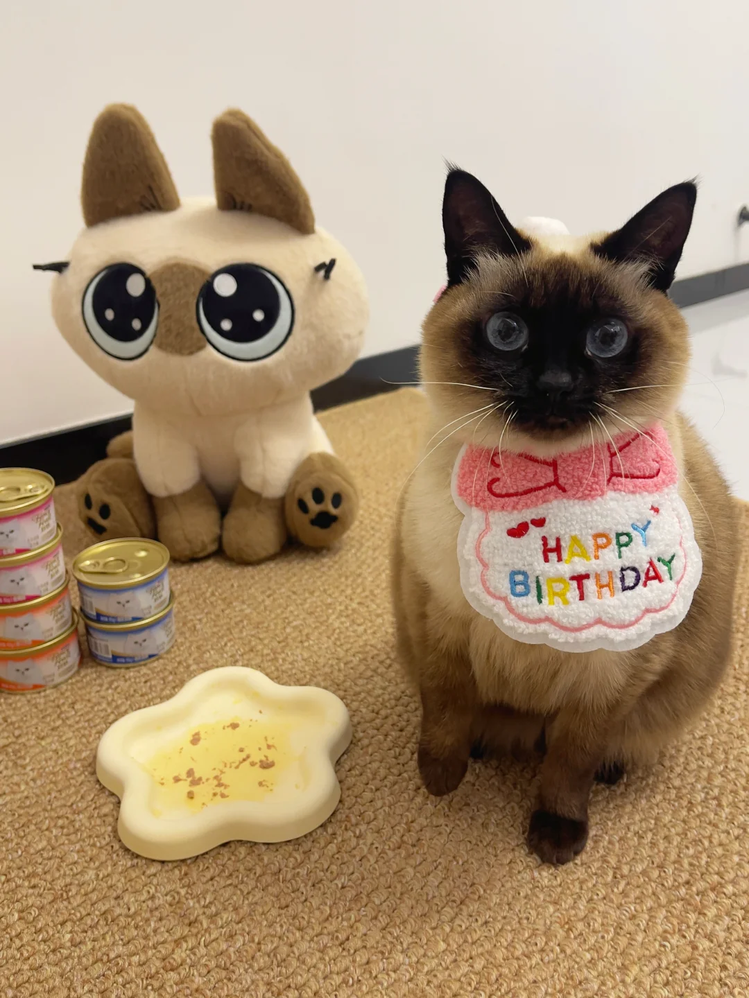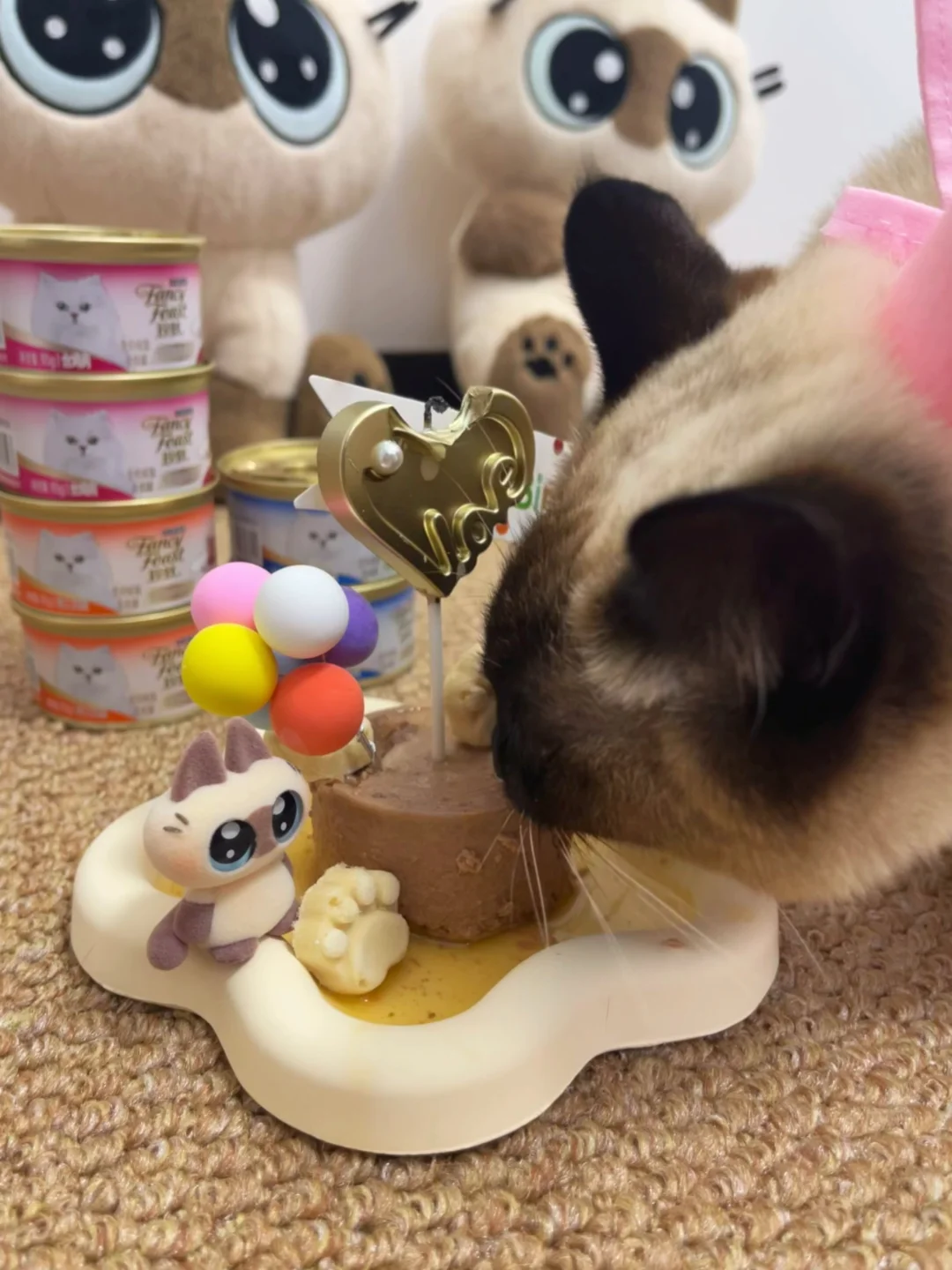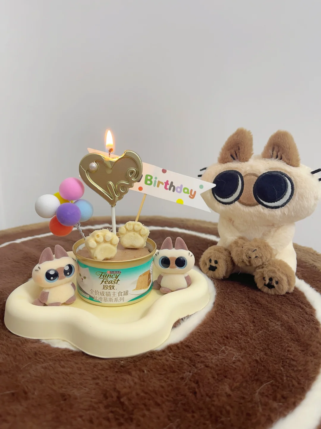 当然啦,仪式感也不能少!蛋糕摆上一点装饰,插上生日蜡烛和摆件,小猫的生日蛋糕就完成啦!祝咪天天有罐罐,吃麻麻香,人和咪永不分离!