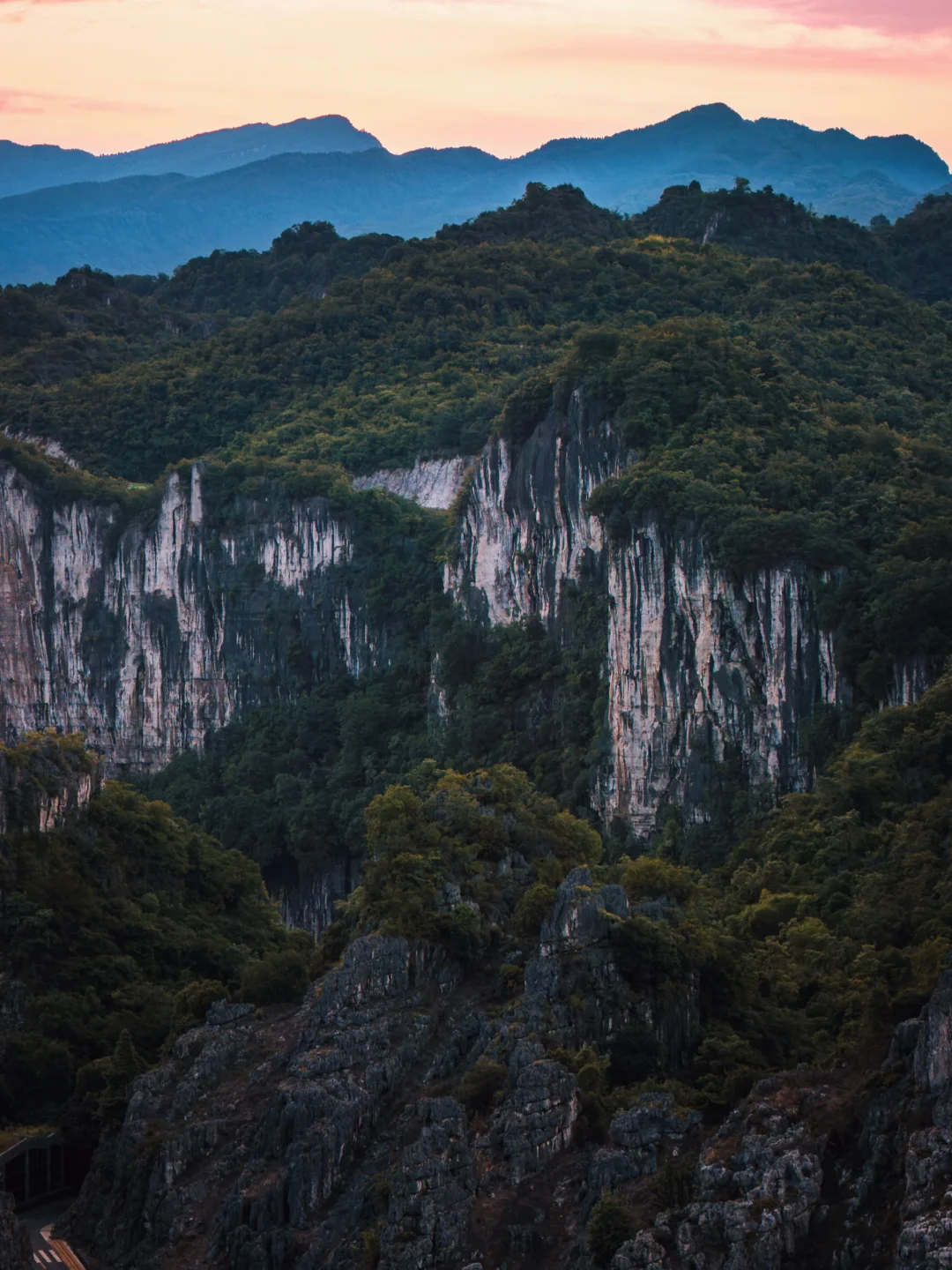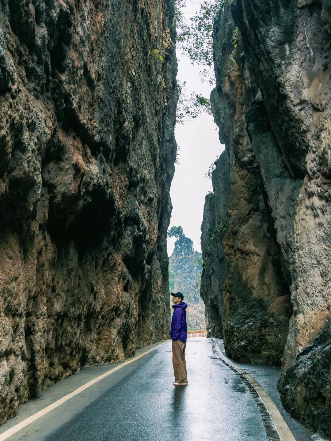 穿过陡峭崖壁的公路,抬头只能看见一条裂缝。